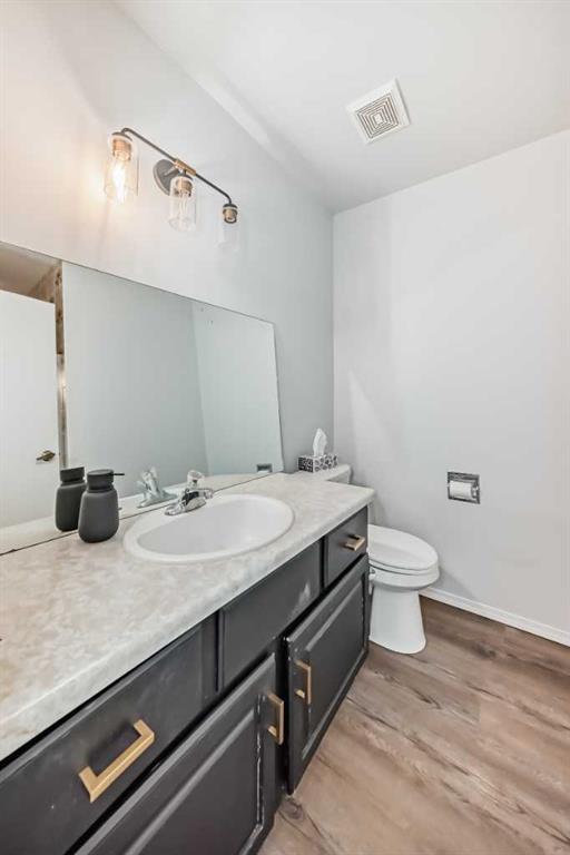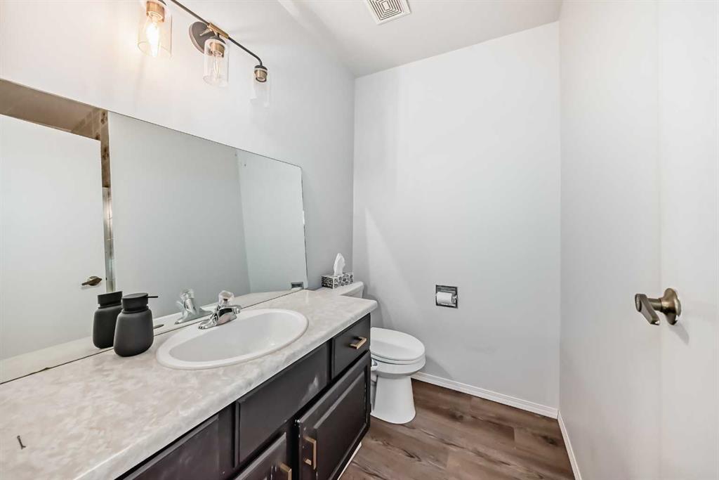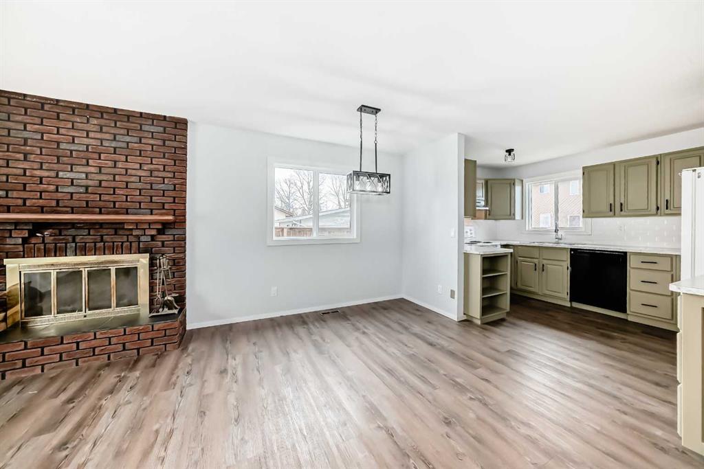 Inside, the main level includes three bedrooms and two full bathrooms, including a primary bedroom with its own 3-piece en suite. Several updates over the past two years bring a fresher feel to the home: vinyl plank flooring throughout the main floor, updated lighting, fresh paint in the home and garage, and kitchen improvements such as painted cabinetry, new counter tops and back splash, and a custom island. All upstairs windows have also been recently replaced, adding efficiency and value. The living room feels warm and inviting with its wood-burning fireplace.