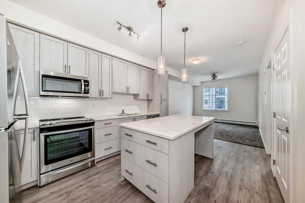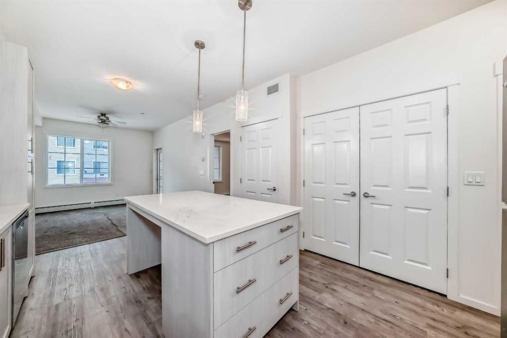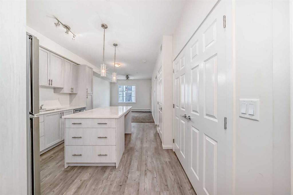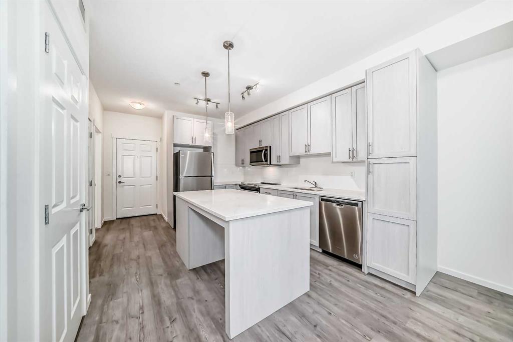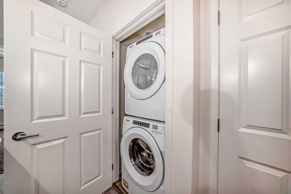 Great Value ! 1 Bedroom Condo in the popular community of Legacy Park. The kitchen features stunning WHITE MARBLE LOOKING QUARTZ countertops, with beautiful grey and white shaker wood cupboards that go all the way to the ceiling! The kitchen is also highlighted with an island and equipped with stainless steel appliances, including a slide out stove, making for a sleek back splash. For your convenience, Your condo also includes an in-suite washer/dryer. The bathroom has the same marble looking quartz counter top, and a grey and white shaker wood cupboard. The bathroom can be accessed from the main area or from the bedroom through the walk-in closet. Your future home comes with a TITLED UNDERGROUND HEATED PARKING spot and an assigned storage locker. And to top it off a nice balcony to enjoy your favorite beverage or meal. Close to walking paths and beautiful ponds, a bus stop around the corner, and stores, restaurants and bars are just steps away.