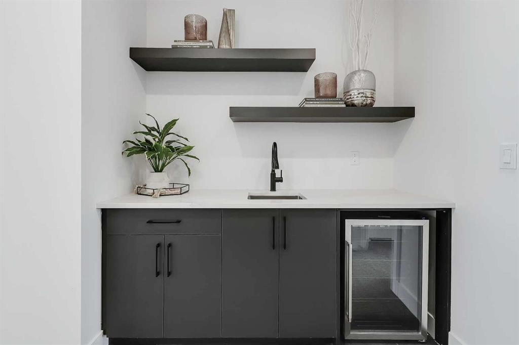 The lower level adds another dimension to the home. The expansive recreation room features a built-in media centre and open shelving, making it the perfect zone for movie nights, gaming, or relaxed gatherings. A sleek wet bar with a beverage fridge and sink elevates the space for entertaining, and an additional bedroom with a full bathroom provides comfort and privacy for guests. Ample storage keeps clutter tucked away, preserving a clean, open feel throughout.