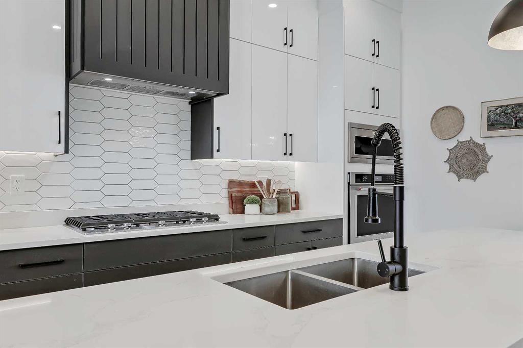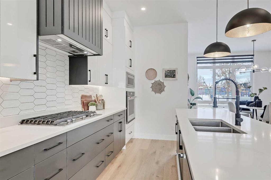 The main floor opens with a refined dining room wrapped in natural light, complete with feature-wall detailing that sets a welcoming, upscale tone. Just beyond, the chef’s kitchen steals the spotlight with a large quartz island, custom cabinetry, and upgraded appliances that make day-to-day cooking feel easy and entertaining feel effortless. A smooth flow leads into the spacious living room, where a full-height tiled gas fireplace adds texture and warmth, balanced by oversized windows framing the south-facing backyard.