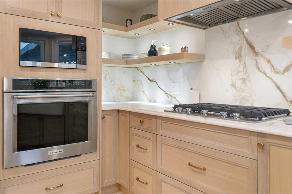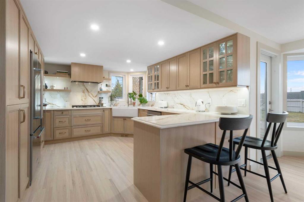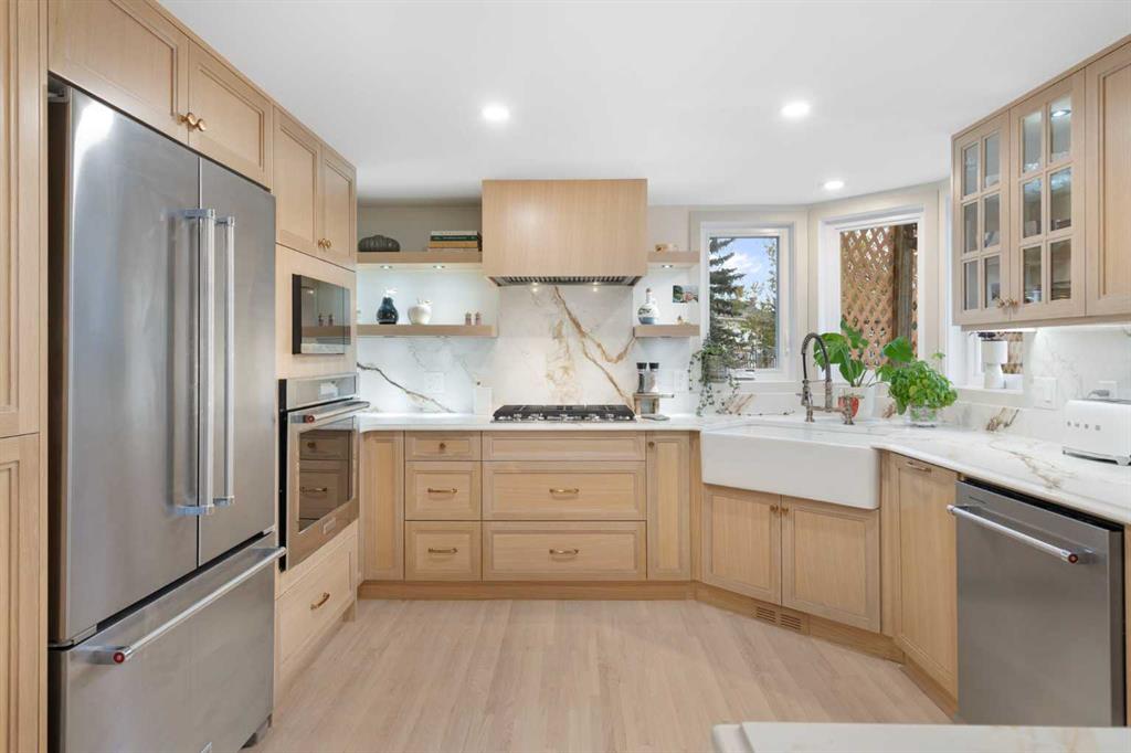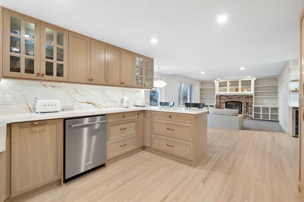 The main level showcases newly re-stained hardwood floors, new carpet, detailed millwork, and a dramatic two-storey living room open to the loft above. The fully renovated chef’s kitchen impresses with granite countertops (beveled edges), full granite backsplash, farm sink, gas range, built-in appliance tower, custom hood fan, open shelving, decorative glass cabinetry, under-cabinet lighting, and new stainless appliances. A formal dining room accommodates large gatherings, while the family room with wood-burning fireplace opens to a bright breakfast nook overlooking the yard. A main-floor den, renovated powder room, updated laundry/mudroom, and wet bar with built-in wine fridge complete this level.