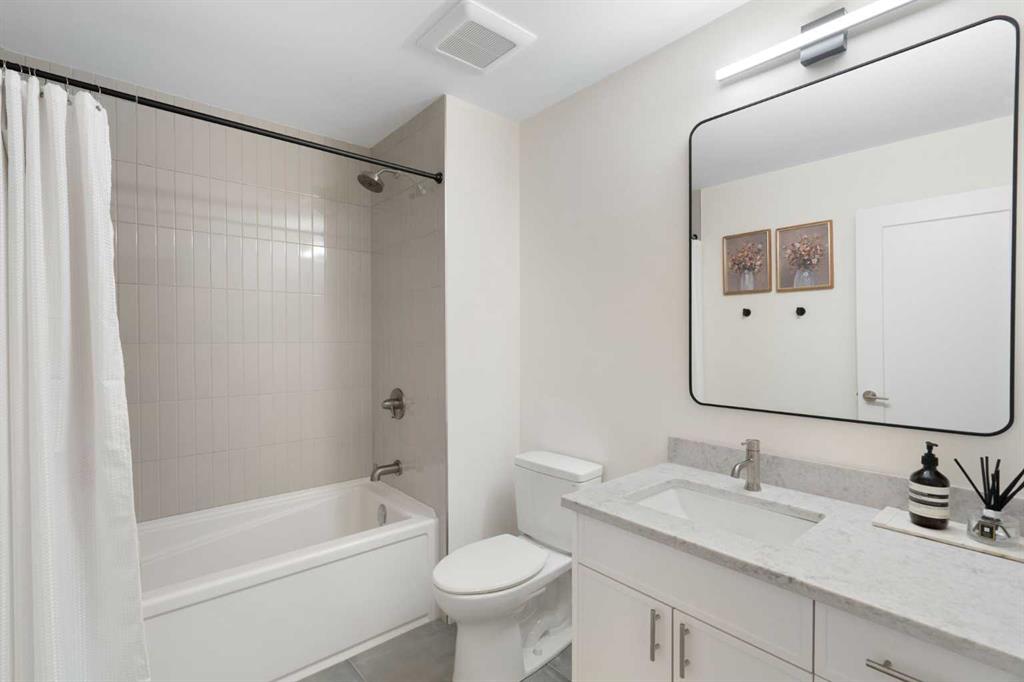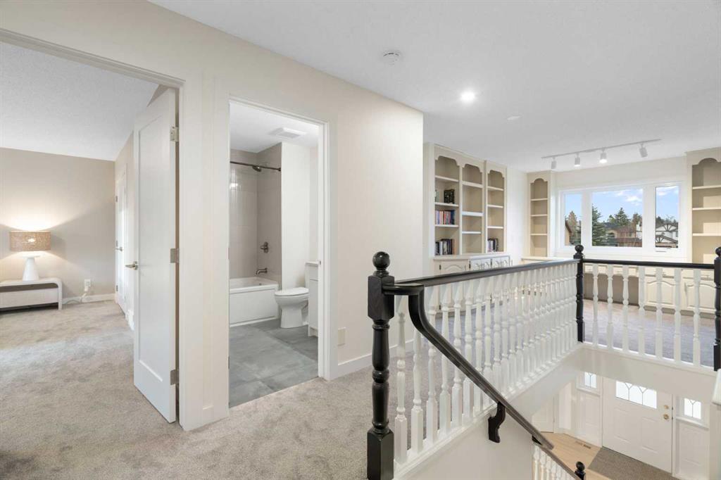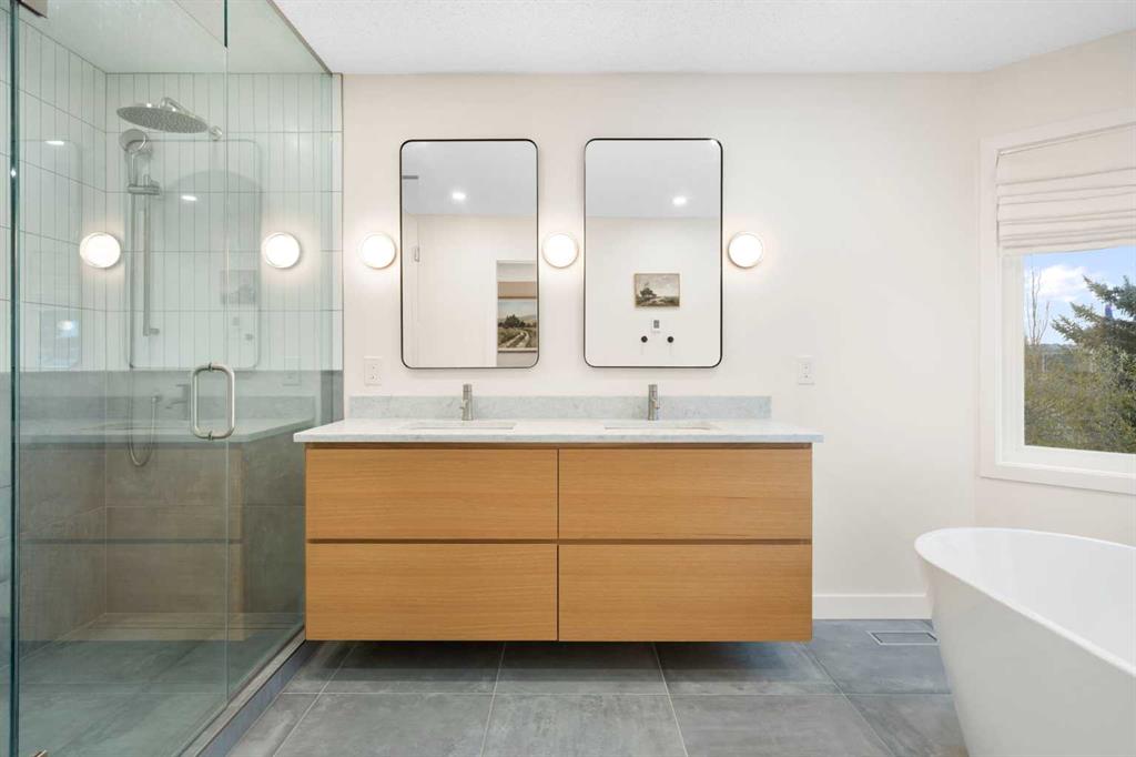 Upstairs, the primary suite features a private balcony with mountain views, a fully renovated spa-inspired ensuite with stand-alone tub, glass-tiled rain shower, floating double vanity, in-floor heating, and a large walk-in closet. Three additional bedrooms, a stylish main bath, and a versatile loft/office complete the upper floor.