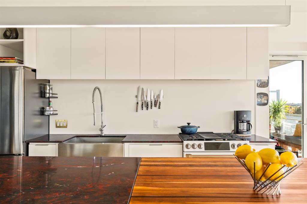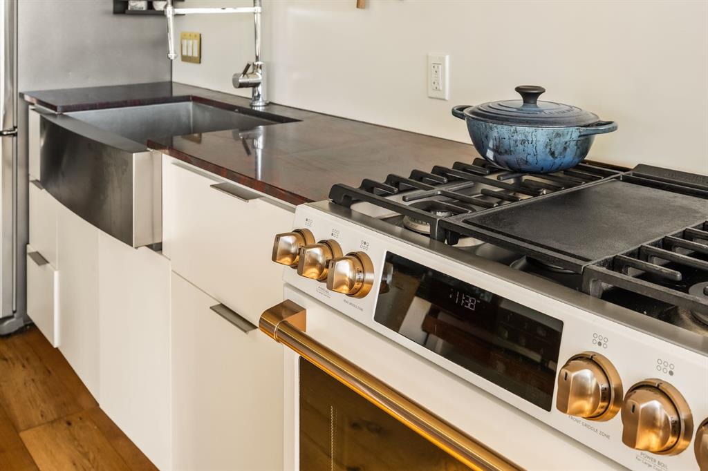 From the moment you enter, every detail has been curated to inspire. A beautifully redesigned front entry offers custom cabinetry, integrated shelving, and a built-in bench, a thoughtful welcome that blends elegance with everyday function. The kitchen, anchored by rare Iron Red stone countertops and a solid hardwood waterfall butcher block island, is both sculptural and soulful. A GE Café gas stove and basin sink with garburator bring culinary precision, while the extended island invites gatherings and conversation.