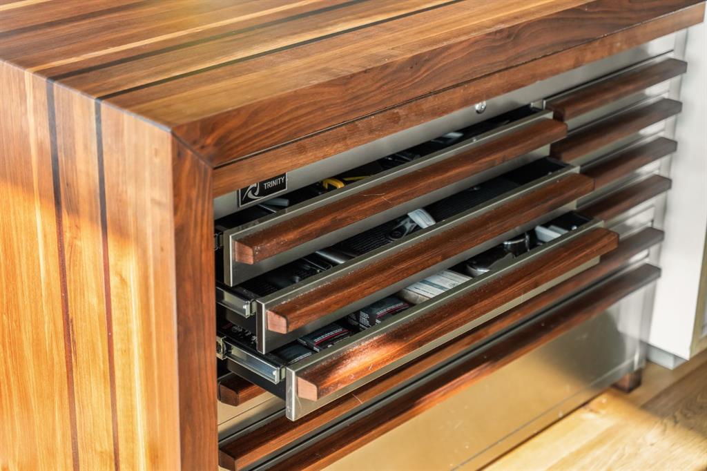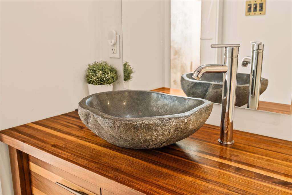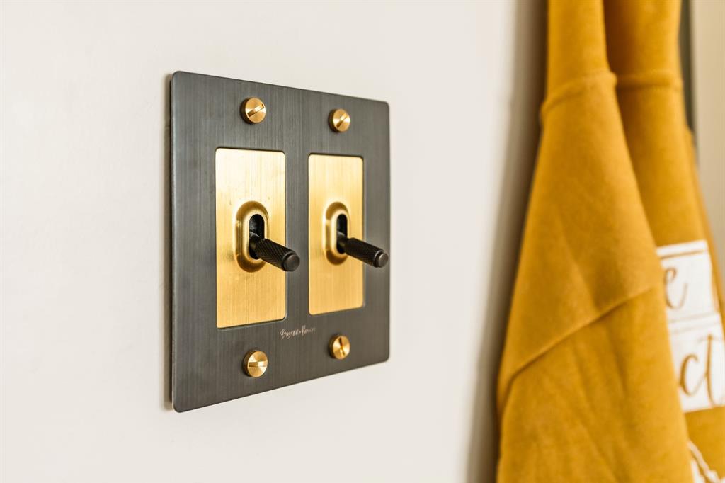 Throughout the home, subtle artistry abounds. Custom wood trim frames every windowsill, walnut corner edging defines the main spaces, and a stunning feature wall with floating beverage shelves transforms the living room into a refined retreat. Each of the three bathrooms is elevated by handcrafted vanities topped with bespoke vessel sinks, while Buster + Punch switches and designer lighting add a quiet note of luxury.