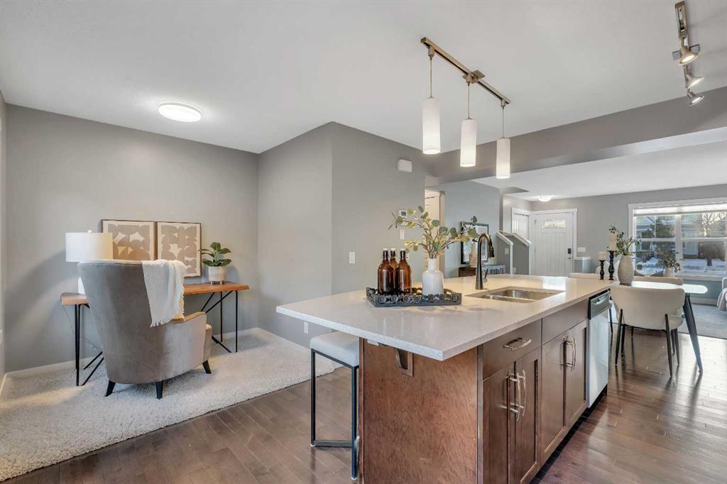 Pride of ownership shines throughout this meticulously maintained, move-in ready end-unit townhome. Step inside to a bright, inviting open-concept main floor, where an abundance of natural light pours through expansive windows, creating a warm, welcoming atmosphere. Thoughtfully designed for both everyday living and entertaining, the space is finished with natural hardwood floors and a stylish chef-inspired kitchen featuring stainless steel appliances, a quartz island, and ample cabinetry. A versatile den on the main level provides the perfect home office or additional storage, while a conveniently located half bathroom completes this floor.