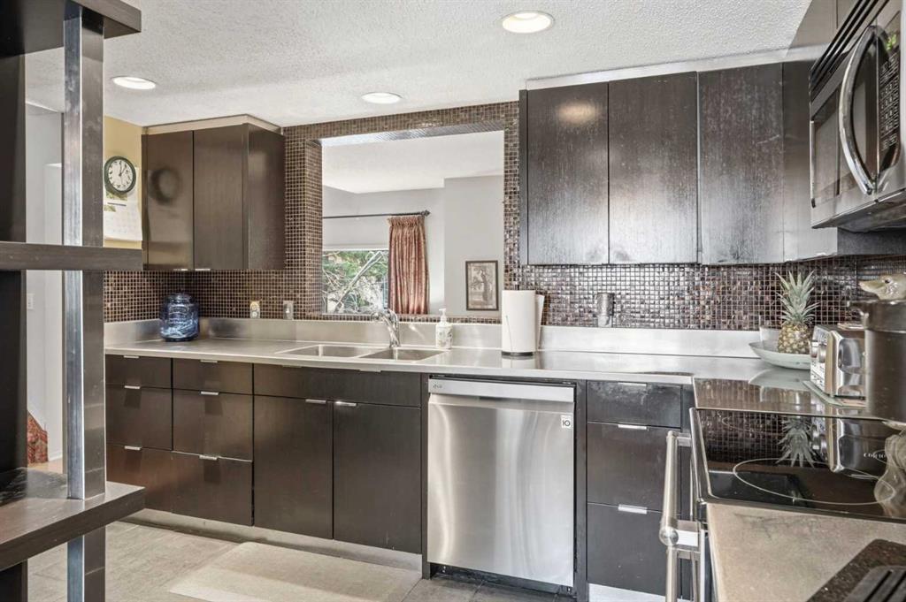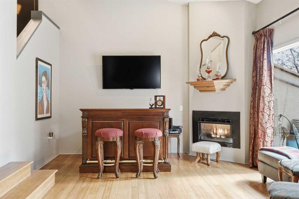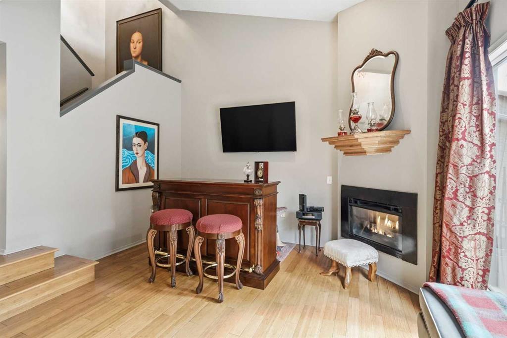 The main level showcases vaulted ceilings, bamboo flooring, and a bright, open-concept living space centered around a cozy gas fireplace. The kitchen is both functional and stylish, featuring sleek black cabinetry, a unique stainless steel countertop, ample storage, and a newer dishwasher (2024)—a modern, design-forward space that stands out from the ordinary.