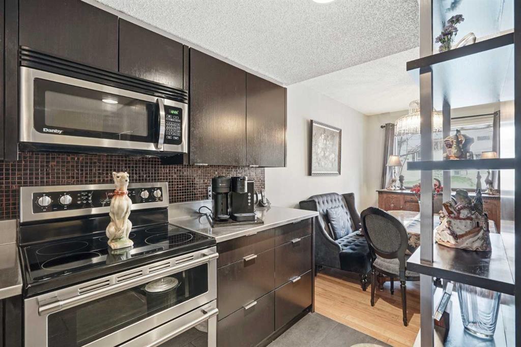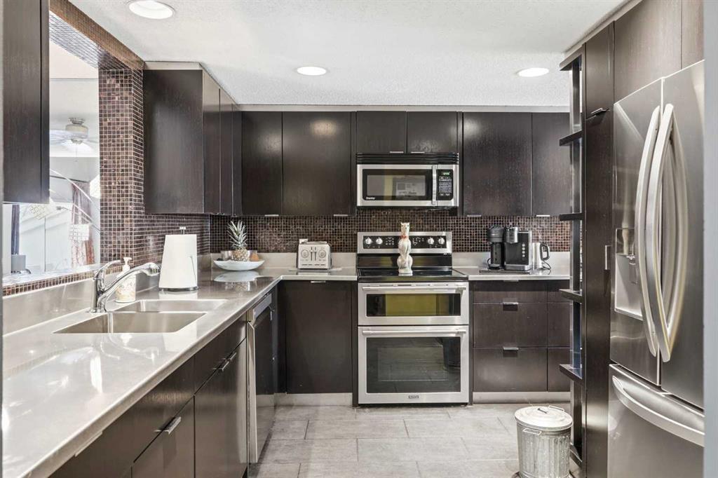 Additional highlights include new furnace and central A/C (2023), Poly-B plumbing replaced, new bedroom windows, and a single attached garage, all within a pet-friendly, well-managed complex with low condo fees.