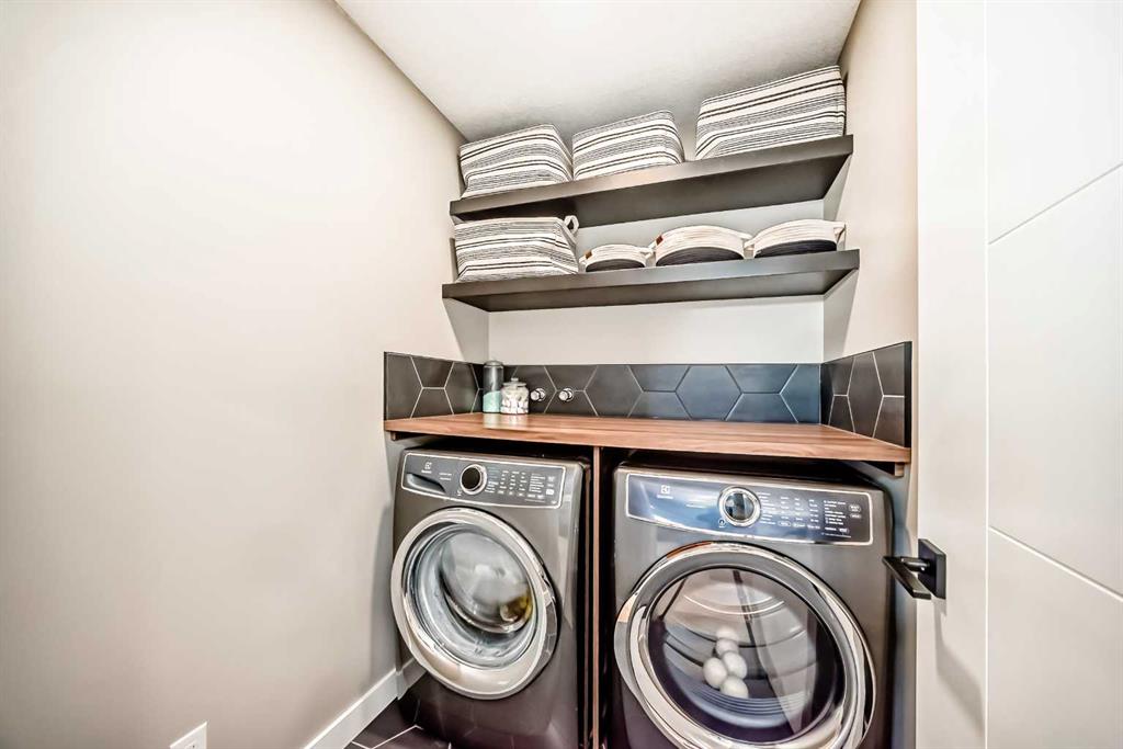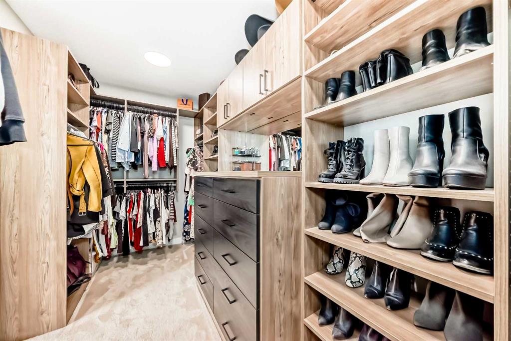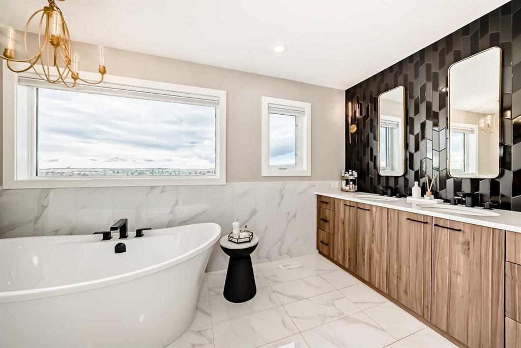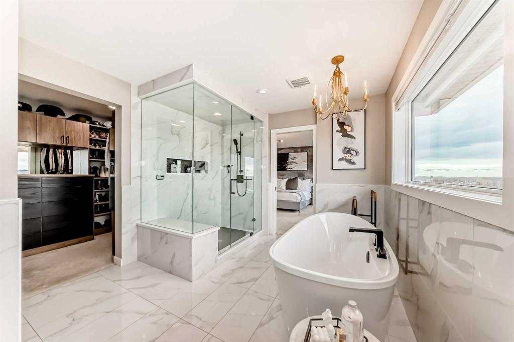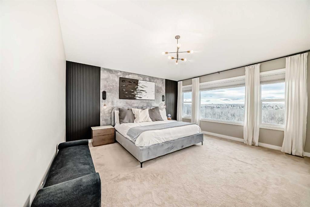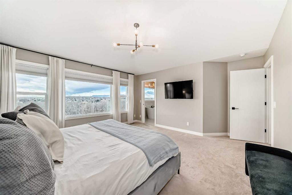 Upstairs, vaulted ceilings elevate both the central bonus room and primary suite, creating volume and an enhanced sense of space. The primary retreat is a private sanctuary with Scandinavian-inspired design and unobstructed views of greenspace and mountains. The spa-calibre ensuite features heated tile floors, steam shower with bench and niche, freestanding soaker tub, and a large walk-in closet with custom California Closets built-ins and integrated lighting. Three additional bedrooms are generously sized, finished with custom wainscoting and designer details, and share a well-appointed Jack & Jill bathroom with dual vanities. A dedicated upper laundry room with built-in shelving and folding counter adds everyday convenience.