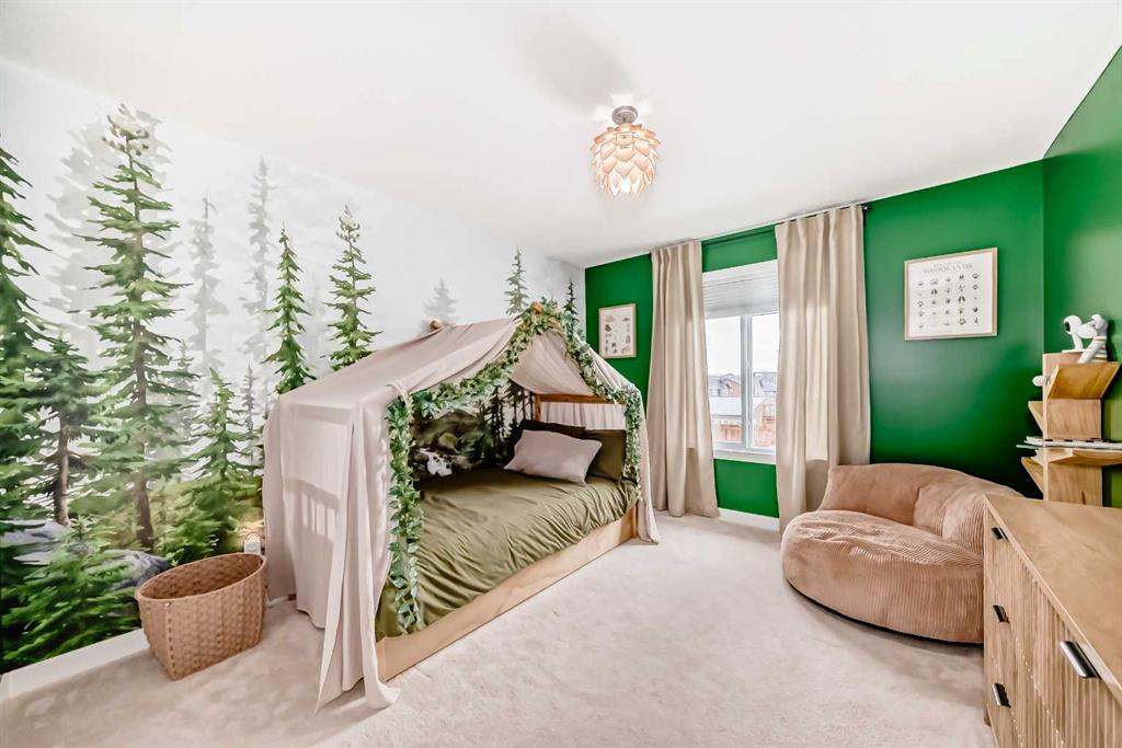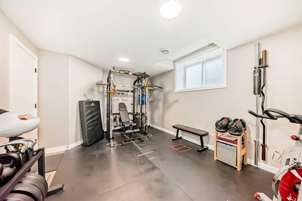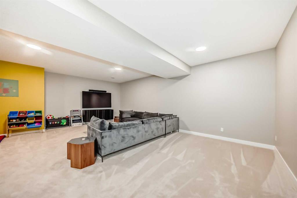 The fully finished basement is designed for both lifestyle and flexibility, offering 9’ ceilings, a spacious rec area, and a custom-built kids’ zone complete with climbing wall, castle fort, slide, ball pit, and swing—an exceptional indoor play experience. A fifth bedroom—currently used as a home gym — adds versatility, along with a 2-piece bathroom and rough-in for a future wet bar.