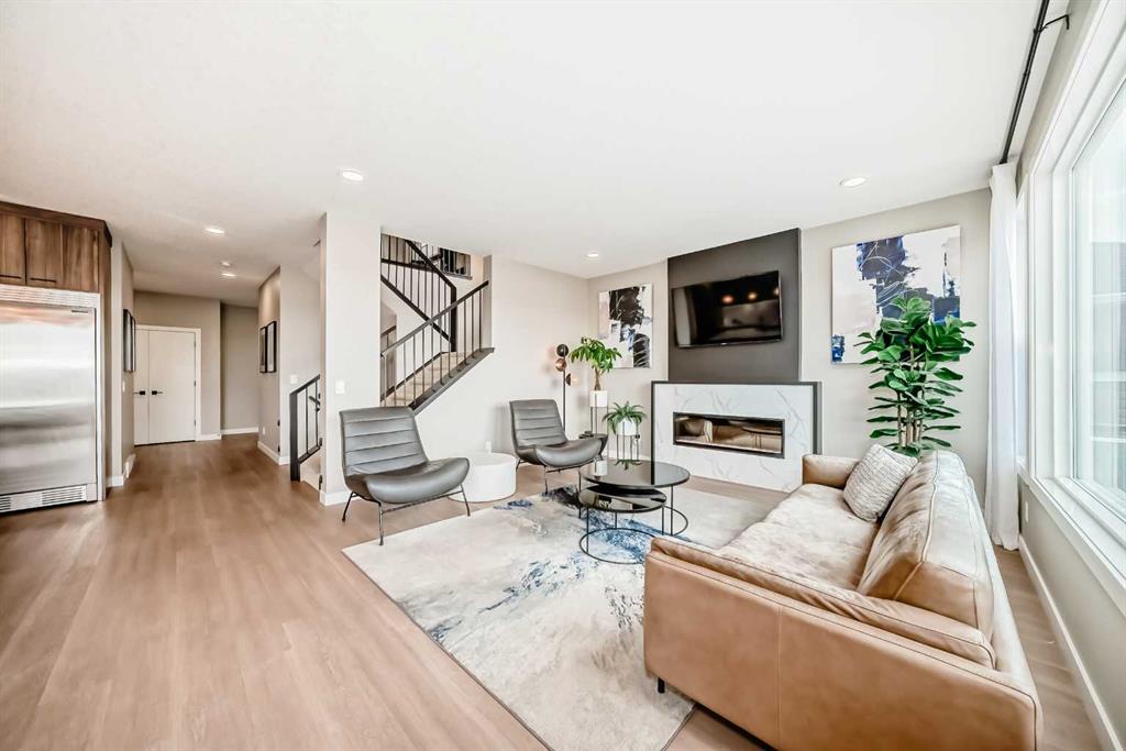 The main floor is open, refined, and designed for modern living. A dedicated front office provides a polished work-from-home space, while the mudroom off the garage keeps everyday life organized and efficient. The main living area is bright and expansive, anchored by southwest-facing windows that capture mountain views and flood the home with natural light. The kitchen is a true centrepiece, showcasing a massive quartz island, two-tone cabinetry, premium stainless-steel appliances, and a fully equipped butler’s pantry with bar fridge, additional storage, and prep space. The dining and living areas flow seamlessly together, highlighted by a sleek feature fireplace and extending out to a cedar deck with glass railings—perfect for effortless indoor-outdoor entertaining.