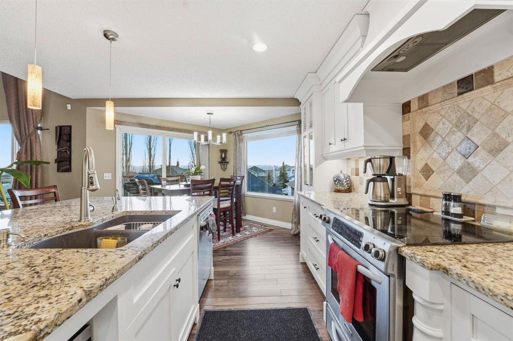 Discover this beautifully maintained 2-storey walk-out home in the NW community of Rocky Ridge, offering breathtaking mountain views and a thoughtfully designed layout ideal for modern living. The open concept main level features high ceilings in the living room, expansive windows, and seamless flow throughout the space. The updated kitchen is a true highlight, perfectly positioned to take in the stunning views and offering ample cabinetry, generous counter space, a corner pantry and direct access to the outdoor deck. Ideal for entertaining or simply enjoying the scenery.