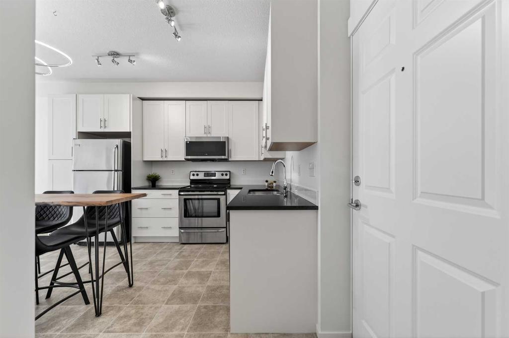 Rare top-floor unit with a sunny south balcony, amazing park & mountain views, AC and 2 titled parking spots! Step into this beautiful unit & enjoy your spacious kitchen with modern lighting, full-height 36” upper white cabinetry, granite countertops, and stainless-steel kitchen appliances which includes a new sleek Microwave Hood-Fan. The living room features an open concept layout with 9’ ceilings throughout & large windows that fill the space with natural light. Step onto your private, sunny south facing balcony with amazing mountain & park views, along with a gas BBQ hookup. The large Primary bedroom includes a spacious walk-through closet leading to a 4-pce bathroom featuring a large soaker tub & shower, a generous cabinet for storage with granite countertop & undermount sink. This unit also includes a new In-Suite full size Washer & Dryer, a spacious walk-in coat & storage closet with an additional dedicated storage space near your parking stall in the underground Parkade. This is a pet-friendly building in a quiet, convenient location. Close to parks, schools, shopping, and with easy access to Stoney Trail and Deerfoot. This home offers both lifestyle and practicality in one beautiful package, so don’t miss your opportunity and book your showing today!