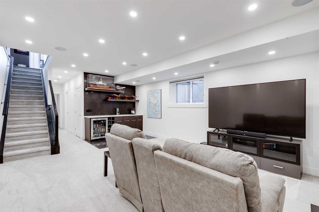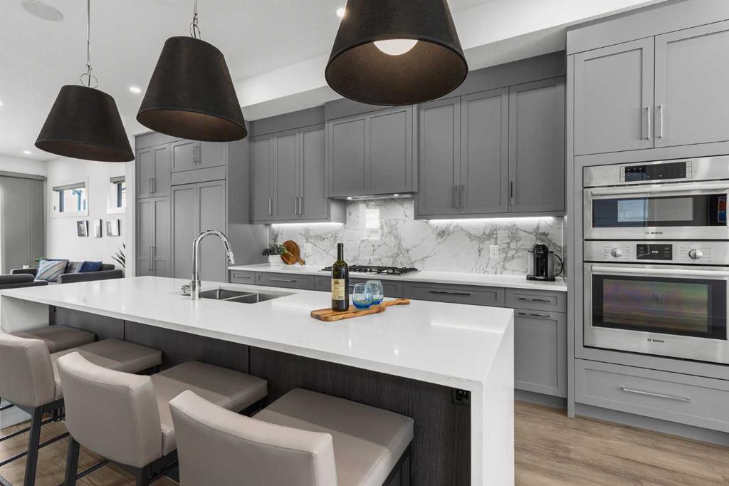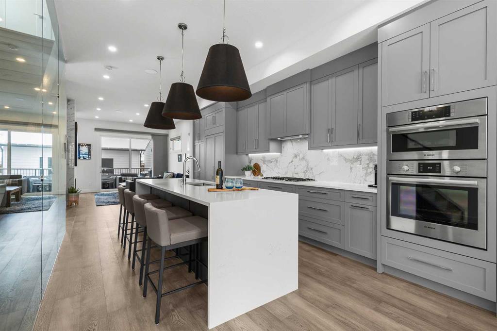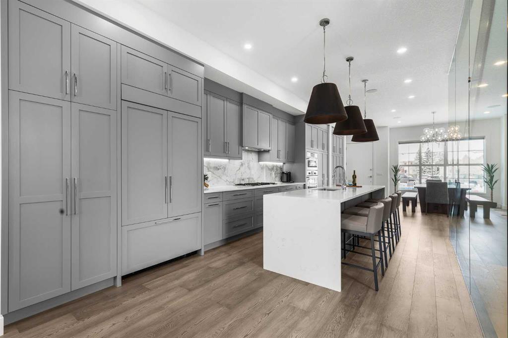 This custom-built detached infill in Parkdale offers over 2,800 sq ft of thoughtfully designed living space, blending refined finishes with everyday functionality. The exterior makes a strong first impression with Hardie board siding, exposed aggregate, and professionally landscaped, low-maintenance grounds featuring rock and artificial turf that looks sharp year-round. Unlike many new builds, the landscaping is fully completed and the home is enhanced with custom Hunter Douglas window coverings, providing privacy, style, and a finished feel from day one. Inside, the main floor is defined by 10-foot ceilings, 8-foot doors, wide plank engineered hardwood, and an abundance of natural light from large windows. The open-concept layout connects the dining area at the front of the home to a well-appointed kitchen and inviting living room at the rear. The kitchen is anchored by a 10-foot waterfall quartz island with seating and complemented by dual-tone custom cabinetry with marble accents, a marble backsplash, and integrated appliances including a JennAir oversized fridge and Bosch wall oven and microwave. The living room centres around a gas fireplace with a full-height marble surround and opens to the backyard through large sliding doors. A functional mudroom with built-in storage, a powder room, and a glass guard staircase complete the main level. The upper level is anchored by a spacious primary suite with plush carpeting and a custom walk-in closet featuring built-in organization. The spa-inspired five-piece ensuite is finished with a deep soaker tub, dual vanities, and a glass-enclosed shower accented by a marble feature wall and bench, delivering a calm and sophisticated setting. Two additional bedrooms, a beautifully finished four-piece bathroom, and a dedicated laundry room with a sink complete this level. The lower level extends the living space with a generous recreation room and a stylish wet bar equipped with a sink and bar fridge, ideal for entertaining. A fourth bedroom or flexible space allows for use as a guest suite, home gym, or private office, and is complemented by a full bathroom and ample storage. Outside, the backyard is designed for ease and enjoyment with a composite deck, gas line for a BBQ, artificial turf, and access to a heated double detached garage finished with epoxy flooring. Air conditioning adds comfort during the warmer months. Parkdale is one of Calgary’s most sought-after communities. You’re steps to the Bow River pathways and close to local favourites like Lics Ice Cream, Lazy Loaf & Kettle, and Nove Nine. Nearby green spaces include the off-leash park, Edworthy Park, and the amenities of the Parkdale Comm Assoc with its playground, rink, and garden. Well-regarded schools and convenient transit options further enhance the area’s appeal, alongside proximity to the Foothills and Children’s Hospital, the U of C, Market Mall, and the growing University District. Downtown is just minutes away, and the mountains are within easy reach.