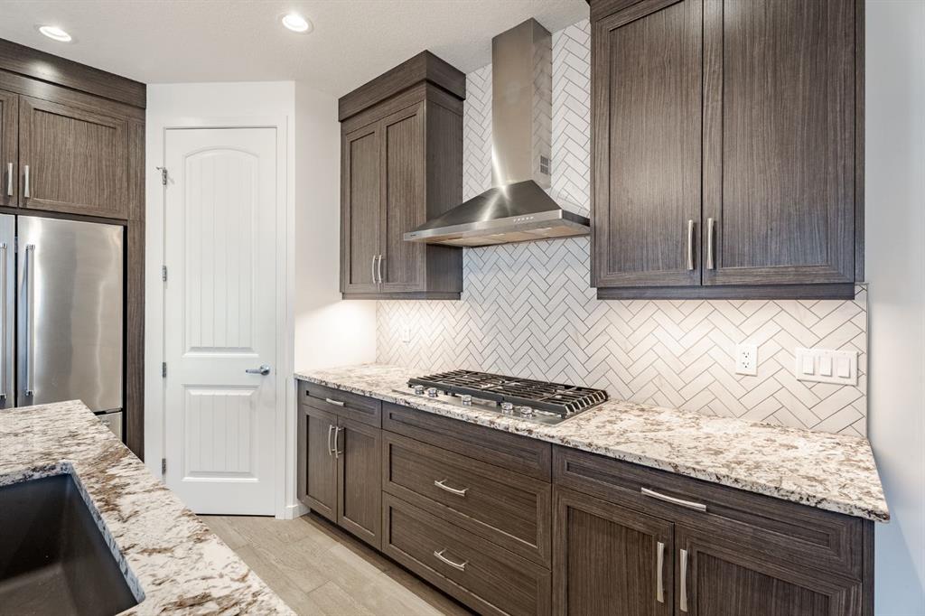 The Open-Concept Main Floor is ideal for both entertaining and everyday living. The Family Room features exposed faux ceiling beams and engineered hardwood floors, while the Gourmet Kitchen is a true showpiece. Enjoy Granite Countertops, Ceiling-Height Cabinetry, Undercabinet Lighting, a Wall Oven and Microwave, Gas Cooktop, and a bar height Island with a large single-basin sink. The built-in Dining Hutch adds both style and function to the space.