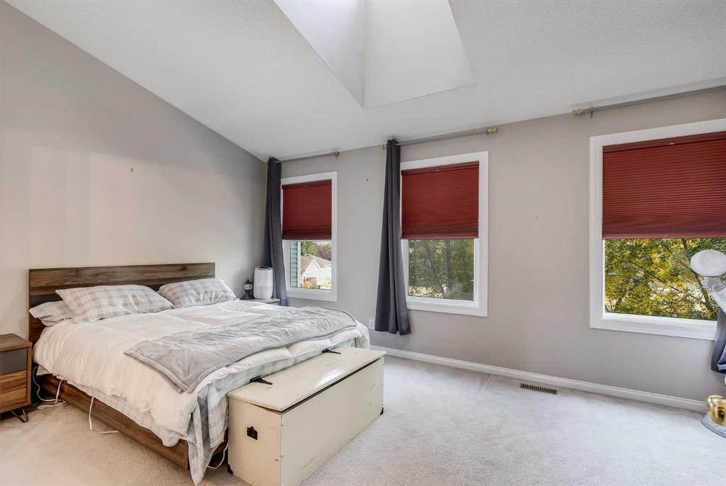 Upstairs you’ll find two generous primary bedrooms, each with its own remodeled ensuite bathroom. The primary suite features vaulted ceilings, a skylight, and a walk-in closet. Convenient upper-level laundry completes this floor.
