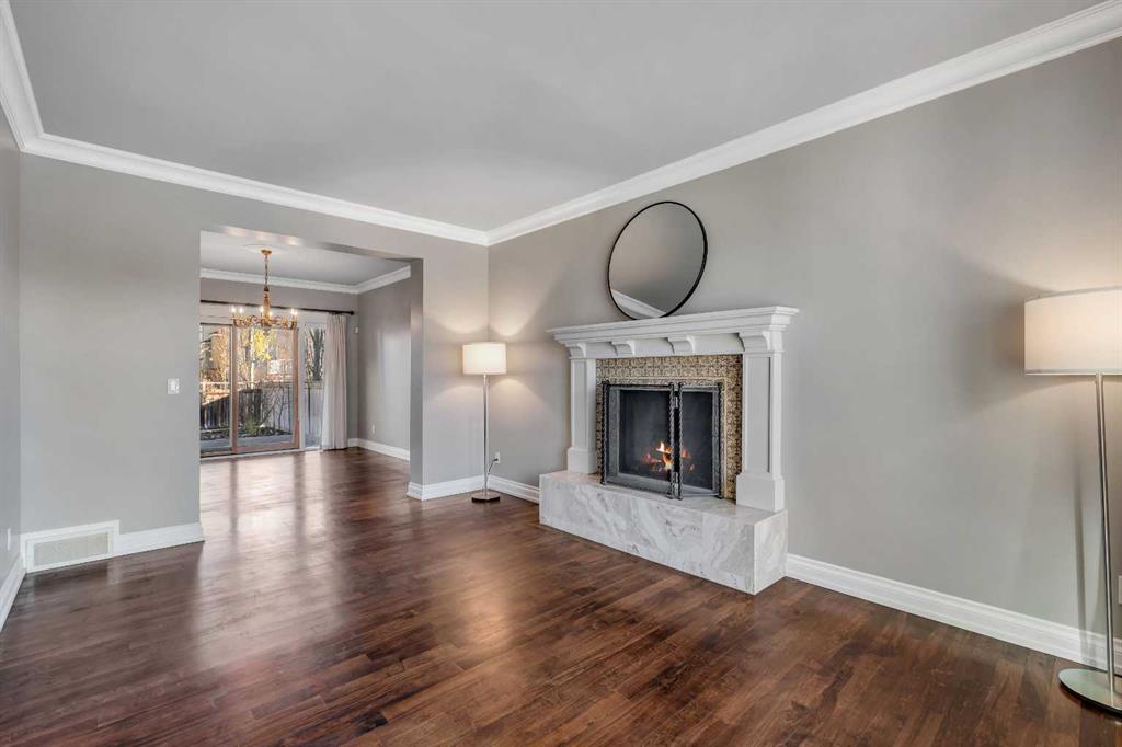 The front formal living room showcases a stunning wood-burning fireplace framed by a traditional mantel and hearth. Adjacent to the living room, the formal dining area features sliding glass doors that open to the backyard, ideal for seamless indoor/outdoor entertaining.