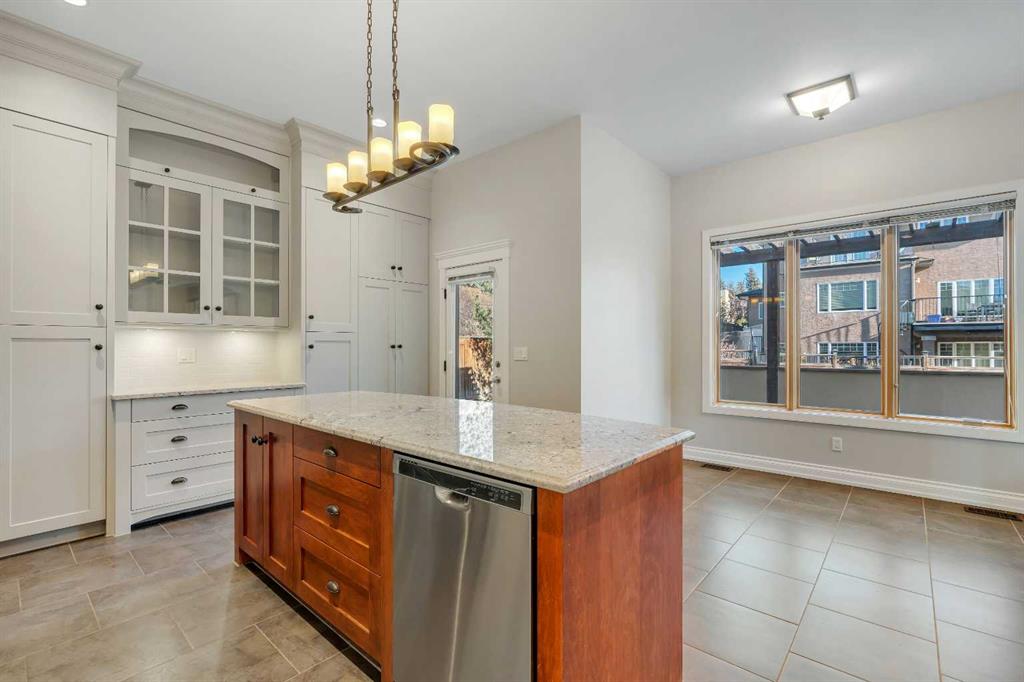 The kitchen is both stylish and functional, with granite countertops, full-height neutral cabinetry, a contrasting wood island, and a bright breakfast nook. On the main floor, the spacious primary bedroom offers the convenience of single level living, complete with a walk-in closet, private ensuite, and direct access to the back deck.