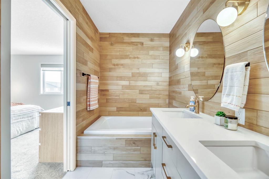 Upstairs, the primary suite offers a true spa-inspired ensuite, fully tiled in wood-look porcelain with timeless sconce lighting, an oversized soaker tub, and a tiled shower featuring a bench and slide-bar hand shower. Secondary bedrooms are generously proportioned and include custom closet systems. A spacious main bathroom provides abundant storage, while the upgraded upper-level laundry includes premium washer and dryer with additional built-in shelving.