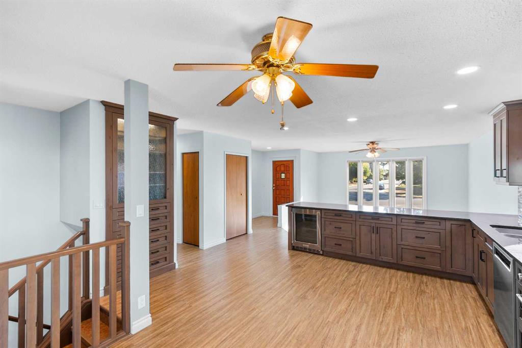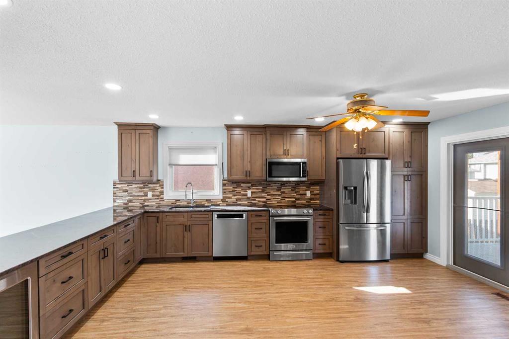 Welcome to this well maintained 4-bedroom, 3-bathroom home, offering 1,212 sq. ft. of comfortable living space in a sought-after family neighborhood—just minutes from schools, parks, and shopping. The main level features a spacious sunken living room perfect for relaxing or entertaining, a bright and functional kitchen with an oversized island, granite countertops, and newer stainless-steel appliances and direct access to a large covered deck. This level also includes two generously sized bedrooms and a 4-piece bathroom. The primary bedroom offers added privacy with a 3-piece ensuite. Downstairs, you’ll find a large recreation room, an additional bedroom, a den or office space, a 4-piece bathroom, and a bonus room—ideal for a gym, playroom, or extra storage. The large laundry room and ample storage throughout the lower level add to the home’s functionality. The front and backyard are beautifully landscaped, creating great curb appeal and a private backyard oasis. A single detached garage sits at the rear of the property for convenient parking or additional storage. This move in ready home offers space, versatility, and a prime location—perfect for families or anyone looking to settle into a welcoming neighborhood.