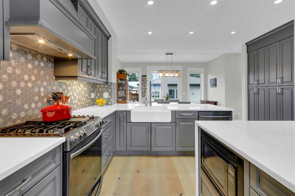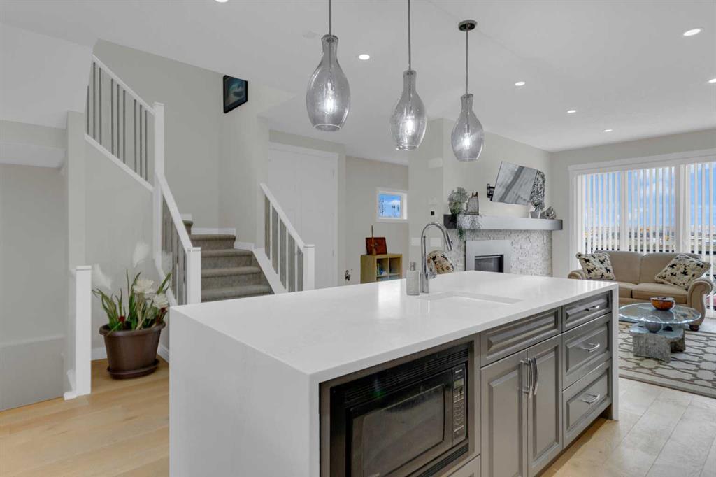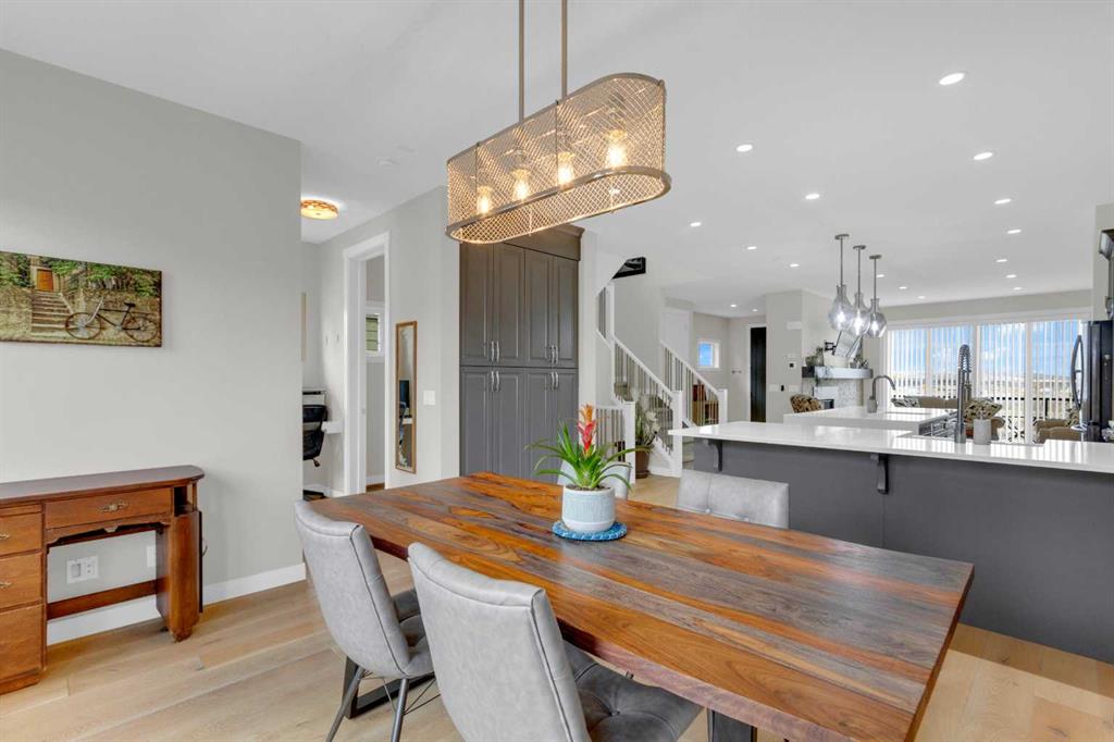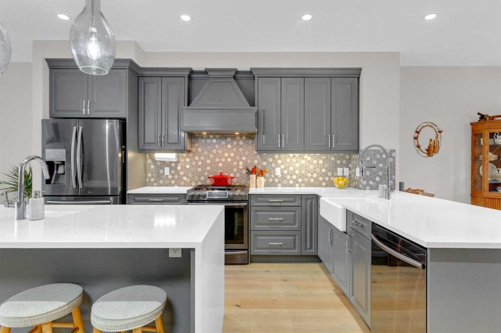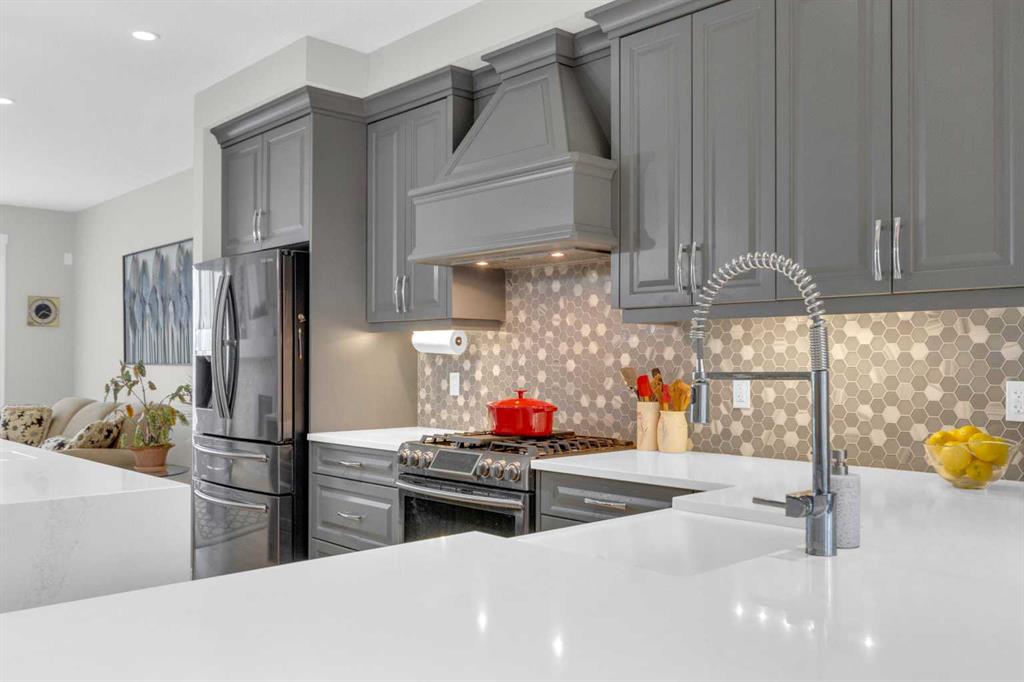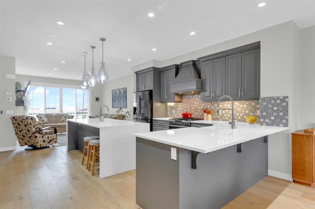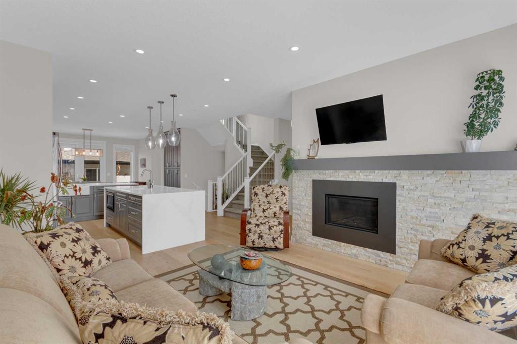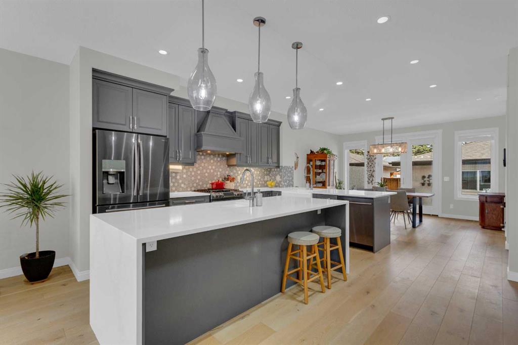 OPEN HOUSE SAT. Welcome to this exceptional, upgraded home in the sought-after community of LAKEVIEW, offering MOUNTAIN VIEWS and an unbeatable lifestyle near parks, pathways, and top amenities. The main floor impresses with 9’ CEILINGS, WIDE PLANK HARDWOOD FLOORING, and abundant natural light from OVERSIZED WINDOWS. Designed for both everyday living and entertaining, the open-concept layout is anchored by a stunning CHEF’S KITCHEN, truly the heart of the home. Anchored by a massive WATERFALL QUARTZ ISLAND and an additional L-shaped counter, this space offers exceptional prep area and countertop SEATING FOR UP TO 10, creating the perfect gathering place for family and friends. Highlights include both a PREP SINK AND SECOND FARMHOUSE SINK, CEILING-HEIGHT CABINETRY, and a full suite of stainless-steel appliances including a GAS RANGE and French door refrigerator. The custom hood fan blends seamlessly with the cabinetry, while striking pendant lighting and a stylish backsplash add a polished, designer finish. With an abundance of cabinetry and thoughtfully designed storage throughout, this kitchen delivers both beauty and function at an impressive scale. The living room showcases a FULL WALL GAS FIREPLACE with impressive stonework, and opens to a spacious FRONT DECK with ELECTRIC AWNING and WEST-FACING MOUNTAIN VIEWS. The dining area easily accommodates a large table and flows seamlessly to the backyard through double FRENCH DOORS, creating effortless indoor-outdoor living. At the rear, A MUDROOM WITH BUILT-IN STORAGE, powder room, and BUILT-IN DESK AREA—perfect for keeping daily life organized. Upstairs, the luxurious primary retreat is a true sanctuary, featuring MOUNTAIN VIEWS, a private JULIET BALCONY, and a versatile SITTING AREA ideal for reading, working, or relaxing. The ensuite includes HEATED TILE FLOORS, a STANDALONE SOAKER TUB, oversized GLASS SHOWER WITH BENCH, PRIVATE WATER CLOSET, and a DOUBLE VANITY with ample storage. The DREAM WALK-IN CLOSET is beautifully designed with CUSTOM SHELVING, CABINETRY, and SHOE STORAGE. Two additional spacious bedrooms with large windows, a full 5-PIECE MAIN BATHROOM with double vanity, and a well-appointed laundry room with abundant storage round out the upper level. The backyard is ready for summer entertaining with a LARGE CONCRETE PATIO and gas BBQ hookup. A DOUBLE DETACHED GARAGE with its OWN ELECTRICAL PANEL adds convenience and functionality. The undeveloped basement offers future potential with a bathroom rough-in. Additional features include roof top SOLAR PANELS and AIR CONDITIONING. Ideally located within walking distance to NORTH GLENMORE PARK, the GLENMORE RESERVOIR, and extensive pathway systems, this home is perfect for outdoor enthusiasts. Enjoy easy access to TOP-RATED SCHOOLS, shopping, Mount Royal University, and major routes including Glenmore Trail, Sarcee Trail, and the ring road—MAKING COMMUTING AROUND THE CITY OR ESCAPING TO THE MOUNTAINS EFFORTLESS. VIEW THE VIRTUAL TOUR FOR THE FULL EXPERIENCE!!
