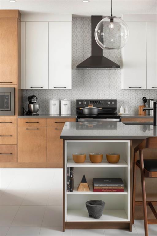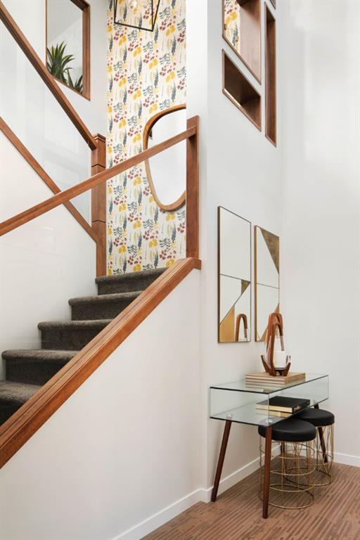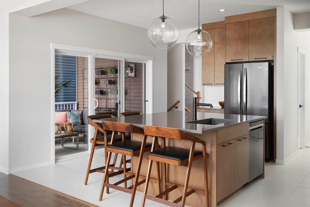 Step inside to discover mid-century modern inspired design blended with warm, contemporary finishes. The open-concept main floor showcases rich wood cabinetry, sleek black stainless appliances, and a large central island perfect for entertaining. Adjacent to the kitchen, the dining area and living space offer seamless flow and style, highlighted by designer lighting, geometric tile accents, and custom millwork.