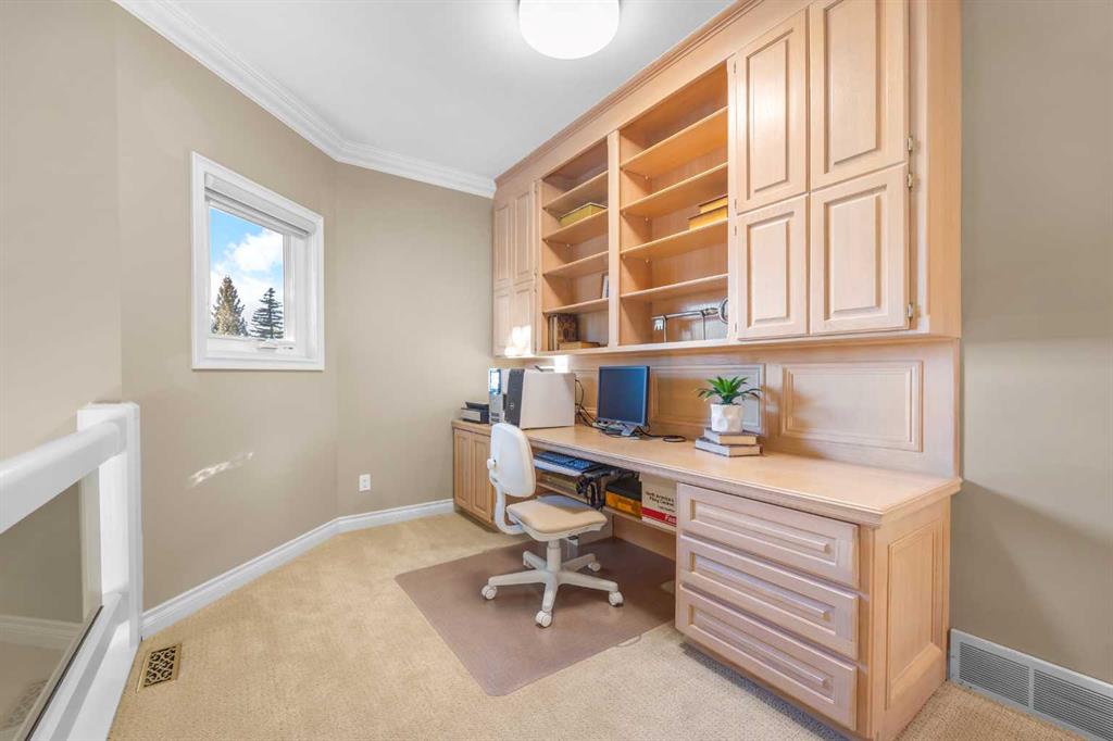 Step outside to your South-East-facing backyard backing onto green space with magnificent views of Nose Hill Park and downtown Calgary. Low-maintenance paved patio gardens and mature landscaping, with direct green space access for peaceful walks. Additional highlights include all windows replaced (2012/2013) and 2 decks with new vinyl (2024).