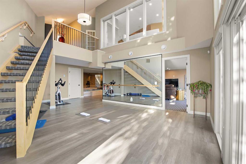 The fully finished walkout basement (2021) with renovated kitchen and bathroom is designed for entertaining and versatile living. A spectacular highlight is the 19-foot vaulted ceiling gym/dance room with skylight and three large mirrors, perfect for fitness enthusiasts, yoga practice, or dance rehearsals. An indoor jacuzzi room and Recreation room offer additional luxury amenities. A full Kitchen with large island, Living room with gas-lit fireplace, Dining area, and 2 bedrooms with 2 full baths complete this exceptional level.