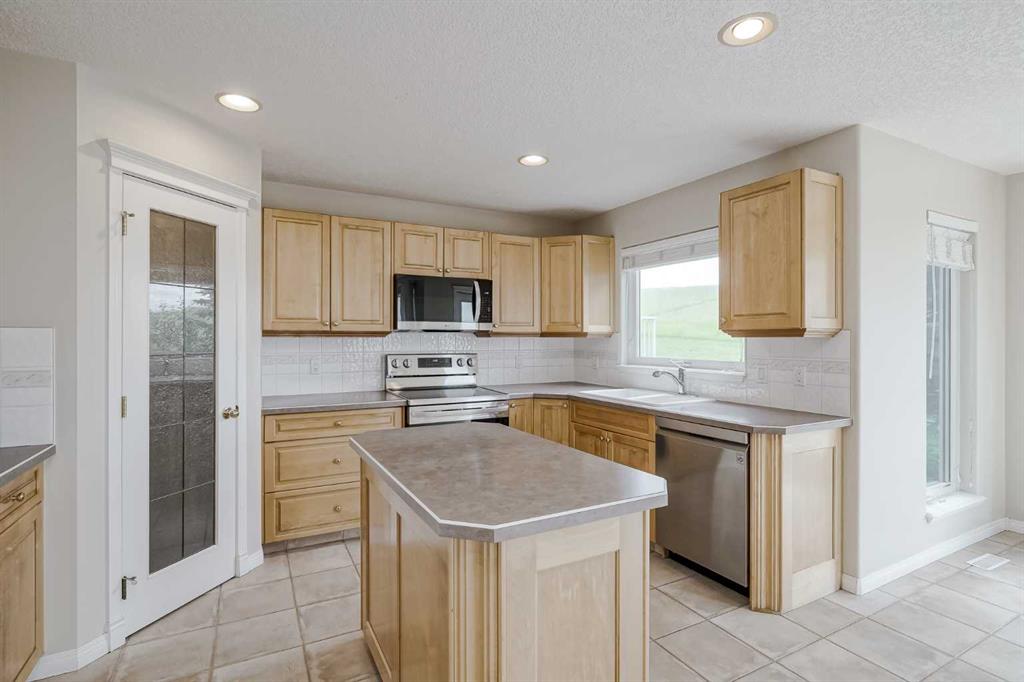 large island, newer stainless steel appliances(2025 fridge, stove ,and microwave), pantry, abundant cabinetry, and a sunny