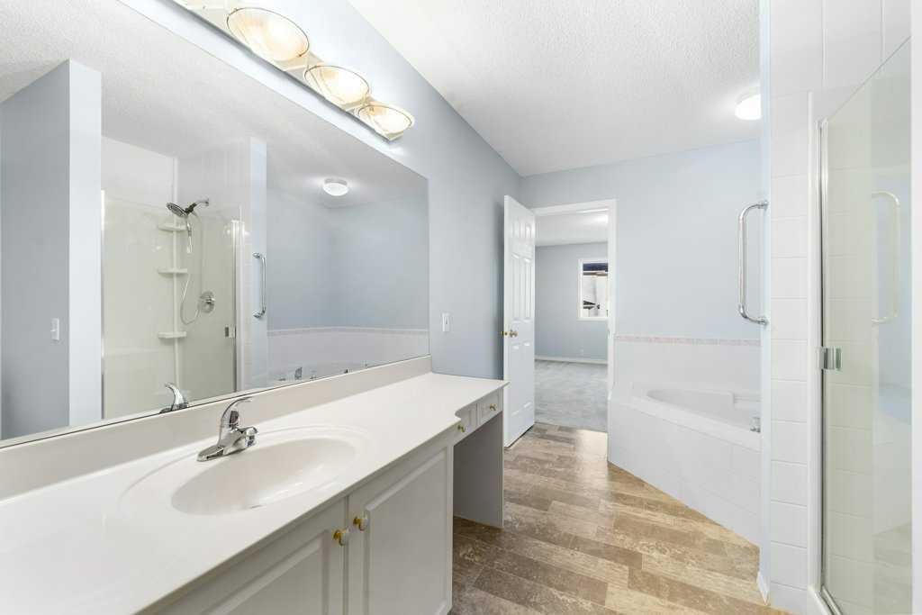 Are you dreaming of a VILLA-STYLE BUNGALOW with NO MONTHLY CONDO or HOA FEES? Are you ready for SINGLE-LEVEL LIVING (everything you need on one level), but STILL WANT TO STAY ACTIVE? How about a VILLA WITH LAKE PRIVILEGES allowing you and your grandkids to visit CHAPARRAL LAKE for swimming, boating, fishing, skating, picnics (a little TENNIS OR PICKLEBALL yourself)? Come see 58 Chaparral Close. Do you like to KEEP BUSY in the GARDEN? You will love this pie-shaped lot where you can BEAUTIFY the gardens to your heart’s delight. With a DOUBLE ATTACHED GARAGE for your cars and a FULLY FENCED YARD for your puppies (rare among villas), you can downsize and still keep the lifestyle you have enjoyed. STEP INSIDE, and you will love the updating and upkeeping that has been lovingly poured into this home. FRESHLY PAINTED main level! Check out the SLATE FLOORING at the FRONT ENTRY, and EXTENSIVE SITE-FINISHED (and RE-FINISHED) HARDWOOD through much of the main. Just BEAUTIFUL! Soaring VAULTED CEILINGS, and PLENTY OF NATURAL LIGHT make the home feel even more spacious! Would you like a separate TV room on the main? The FRONT OFFICE could double as a TV room (with interior window and a french door to make it quiet but still visible and bright)! Do the kids and grandkids love to come your way for DELICIOUS FAMILY MEALS? The dining room is great for your SPECIAL GATHERINGS, with ELEGANT PILLARS AND ARCHWAY ENTRY! Check out the kitchen! The KITCHEN CABINETRY has been RE-MODELLED (changing the original angled island to a highly functional LARGE RECTANGULAR ISLAND with BREAKFAST BAR and ‘SILGRANITE’ SINK with updated fixture)! Corner pantry, STAINLESS-STEEL kitchen appliances. The main level primary bedroom has a good-sized WALK-IN CLOSET & FANTASTIC ENSUITE BATHROOM with a CORNER SOAKING TUB plus an EASY STEP-IN SHOWER! The LIVING ROOM has a LARGE TRIANGULAR WINDOW, extending in the peak of the VAULTED CEILING, plus a COZY 3-SIDED GAS FIREPLACE with art niche & built-in shelving. Main level laundry! STEP OUT BACK to your two-tiered deck with added distance from decks on either side, thanks to the pie-shaped lot. WIRING FOR a HOT TUB has been run to a lower patio. Back inside, now HEAD DOWNSTAIRS to your FINISHED LOWER LEVEL! Over 1000 SQ.FT. finished down (for a total of 2400 SQ.FT.). The lower level features 2 GUEST BEDROOMS, a FULL BATHROOM, VERY LARGE REC ROOM, and a little LIBRARY OR COMPUTER SPACE. This home has never been on the MLS until now. Updates include: REFINISHED HARDWOOD 2013. SOME KITCHEN RENO’S IN 2013. NEW WATER HEATER in 2019. NEW FURNACE IN 2023. FRESH INTERIOR PAINT – 2025. NEW WATERLINES IN 2025!