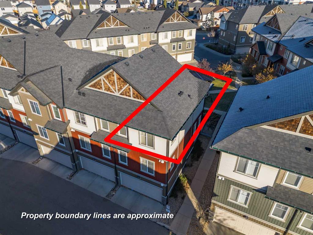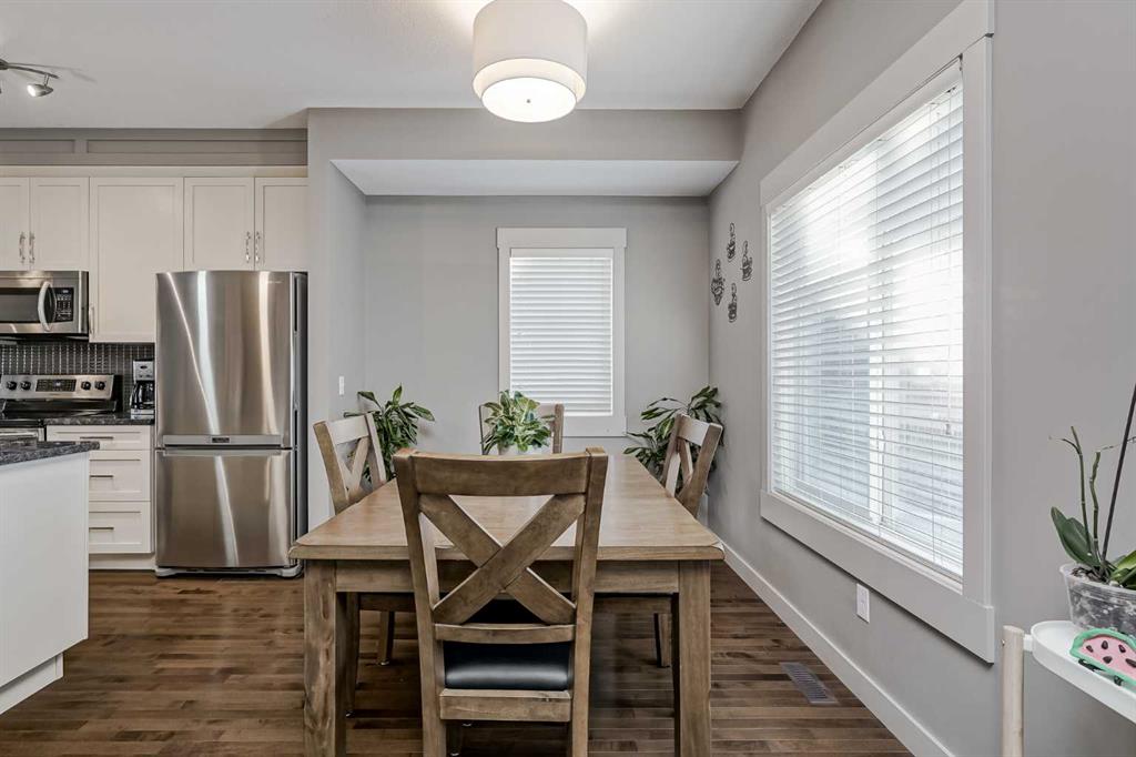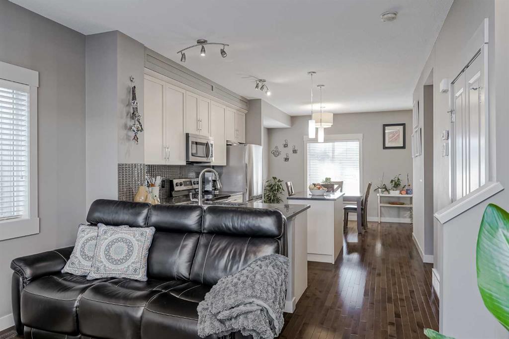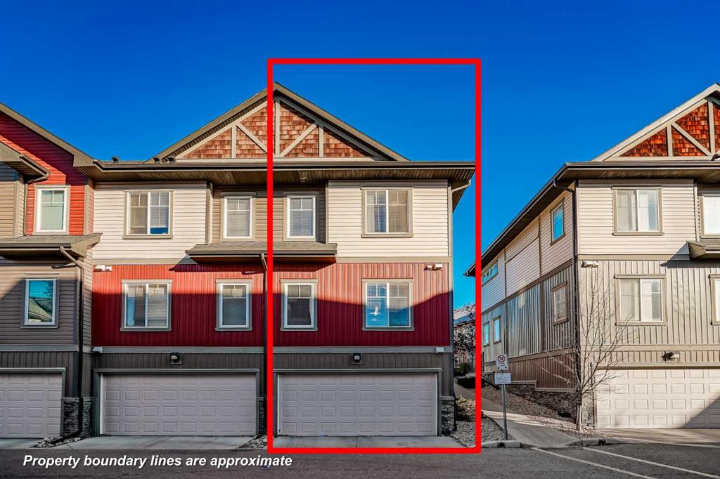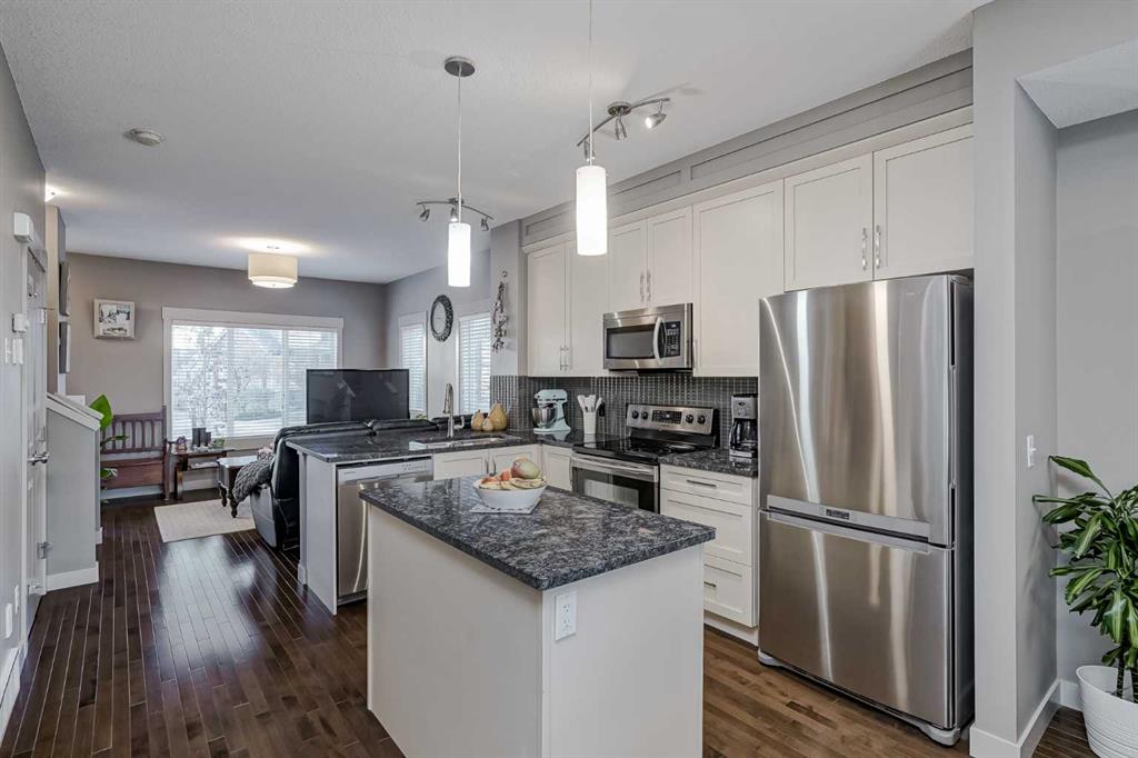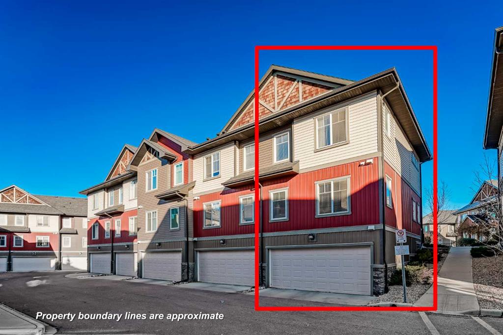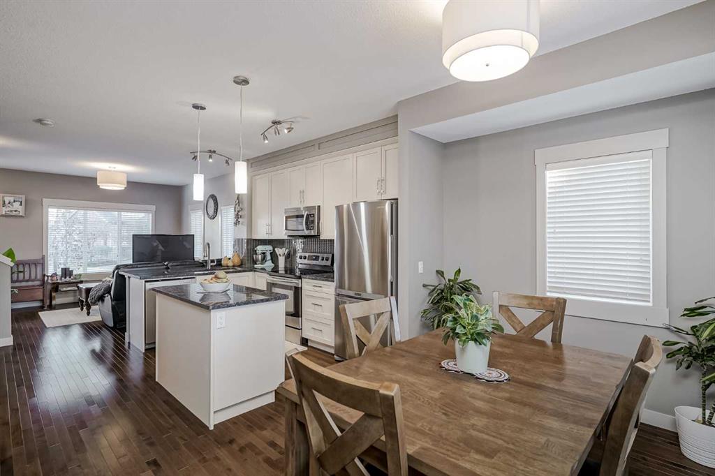 WELCOME TO SKYVIEW RANCH! This is the spacious, well-appointed home you have been waiting for—a true corner unit masterpiece ready for immediate enjoyment. Built in 2011, this bright and beautiful townhome was a former show-home, featuring an attached double car garage and a large, inviting front patio. Inside, the generous 1,100 sq. ft. floor plan is designed for modern living. The main level boasts beautiful hardwood floors throughout and an open-concept layout centered around a functional kitchen. This space is equipped with elegant granite countertops, ample cabinet storage, and flows perfectly into a generously sized dining room. Large windows flood the living space with natural daylight, and a versatile nook offers the ideal spot for a home office or den. Upstairs, a large primary bedroom awaits, complete with its own private ensuite and loads of closet space. Down the hall, two wonderfully arranged bedrooms share a full bathroom. Located in the heart of Skyview Ranch, this home offers an unbeatable lifestyle. You are just steps away from local playgrounds, schools, and shopping. Combining convenience, space, and a premium location, this home truly is perfect for everyone!