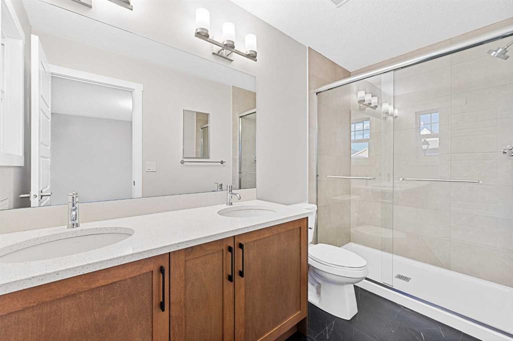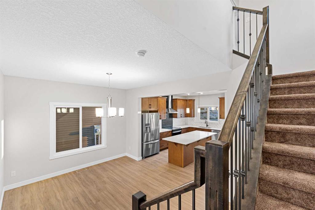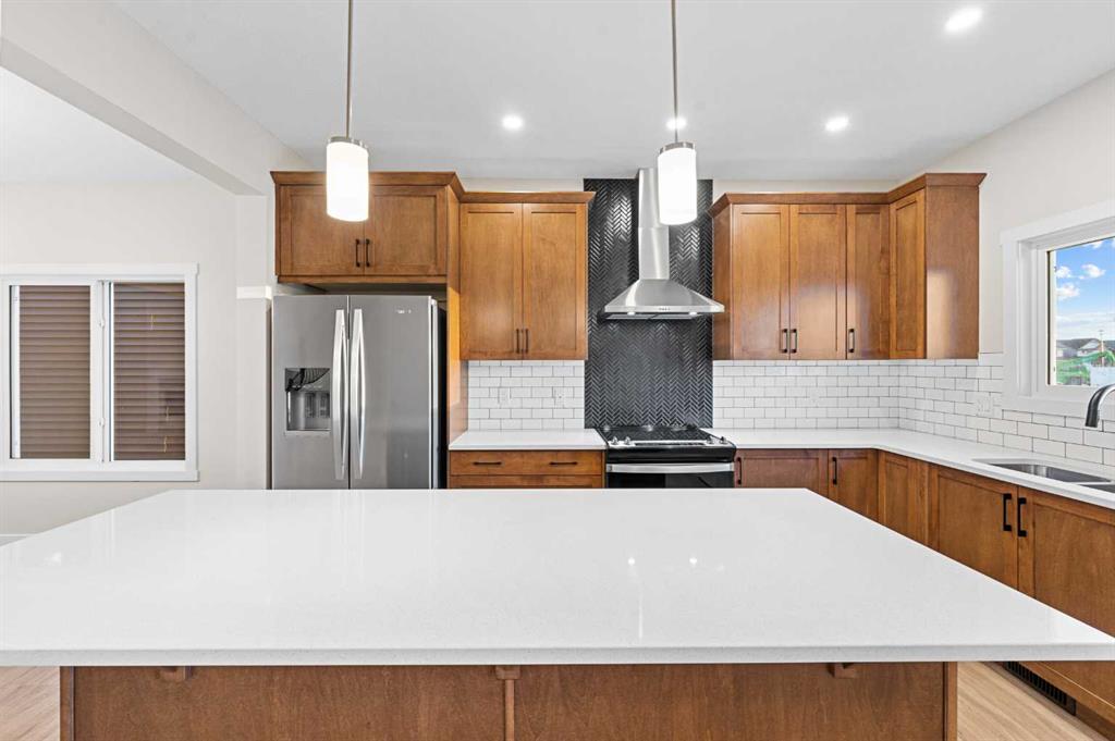 Move-In Ready | 2024 Build | East/West Facing | 1,580 SqFt | 3-Bedrooms | 2.5-Bathrooms | Incredible Living Space | Quartz Countertops | Stainless Steel Appliances | Beautiful Finishes | Open to Below Ceilings | Pot Lighting | Open Floor Plan | Electric Fireplace | Large Windows | Upper Level Laundry | Side Entry to Basement | Alley Access. Welcome to your stunning 2-storey home in Bayside with 3 bedrooms, 2.5 bathrooms and an expansive living space. The main and upper levels boast 1580 SqFt with an additional 701 SqFt in the unfinished basement. Open the front door to a foyer with views into the open concept main level. The front living room is framed with large windows beaming with morning sunlight through the East facing windows. The living room is paired with an electric fireplace adding both style and comfort to this space. The open floor plan compliments a smooth transition from living to dining. The kitchen is outfitted with ample cabinet storage, a bold and stylish black herringbone accent backsplash, quartz countertops, stainless steel appliances and a centre island with barstool seating. The kitchen is also includes a gas line to the stove! The kitchen has a pantry for dry goods storage too! Off the kitchen is a rear coat closet and back door that leads to the backyard and rear parking pad. The main level is complete with a 2pc bath. Upstairs holds 3 bedrooms and laundry. The primary bedroom is grand with a walk-in closet and a private 4pc ensuite bath with a walk-in shower and a double vanity. Bedrooms 2 & 3 are both a great size with closet storage and share the main 4pc bathroom with a tub/shower combo. The laundry is located on this upper level in a deep closet to not take away from any of your living space. Downstairs, the basement has a separate side entry and has rough-in plumbing! This space can be easily transformed to fit your family’s needs. Outside is a great sized backyard with space for a deck and a rear detached double garage! Hurry and book your showing at this incredible family home today!