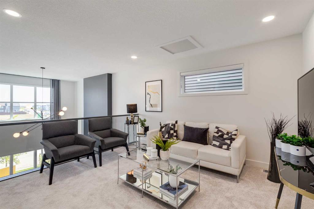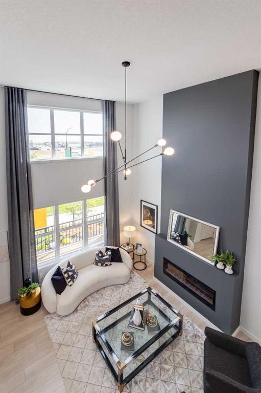 The living room itself rises TWO STOREYS HIGH, anchored by a bold painted feature wall with an ELECTRIC FIREPLACE and clean mantle ledge. Windows stack one above another, pulling daylight into every corner. GLASS RAILING from the bonus room above keeps the sightlines open, so even upstairs you feel part of the action.