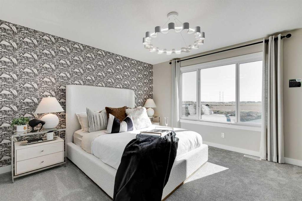 Welcome to the Copeland by Sterling Homes Calgary this beautifully designed home offering modern finishes, flexible living, and a fully legal basement suite for added value. The kitchen is equipped with stainless steel appliances, chimney hood fan, gas range, built-in microwave, and a walk-in pantry with elegant French door. The main floor includes a bedroom and full bath—perfect for guests or multi-generational living—along with a cozy electric fireplace featuring a maple mantle and tile surround. Upstairs, enjoy a vaulted loft, convenient upper floor laundry, and a well-appointed ensuite with a fiberglass base shower with tiled walls, tile flooring, and a bank of drawers. The 1-bedroom legal basement suite includes its own bathroom with a tiled shower. Additional highlights include LVP flooring throughout the main floor and upper common areas, maple railing with iron spindles, triple pane windows, extra windows for abundant natural light, side entrance, 9’ basement ceilings, and a rear deck with BBQ gas line rough-in—perfect for comfortable living. This energy-efficient home is Built Green certified and includes triple-pane windows, a high-efficiency furnace, and a solar chase for a solar-ready setup. Home includes blower door testing for energy efficiency, plus an electric car charger rough-in, it’s designed for sustainable, future-forward living. Featuring smart home technology, this home includes a programmable thermostat, ring camera doorbell, smart front door lock, smart and motion-activated switches—all seamlessly controlled via an Amazon Alexa touchscreen hub. Photos are a representative.