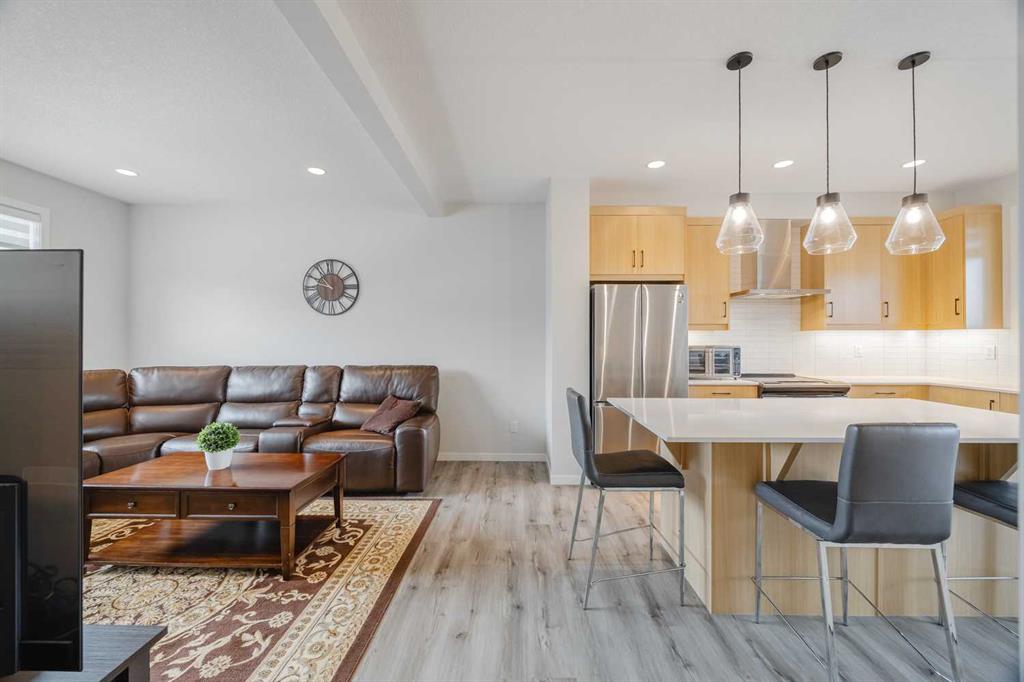 Discover the inviting charm of this 4-bedroom, 2.5-bath 3-storey townhome offering over 1,650 sq. ft. of finished living space in Walden, backing onto peaceful green space. The main floor features 9-ft ceilings and a bright, open layout with large windows, modern finishes, and a stylish kitchen with stainless steel appliances, quartz counters, ample cabinetry, and a central island perfect for everyday living and entertaining. The dining area seamlessly connects to a private balcony overlooking the park—ideal for morning coffee or summer barbecues. Upstairs you’ll find three comfortable bedrooms, convenient upper-level laundry, and a spacious primary bedroom with a walk-in closet and a 4-piece ensuite. The fully developed lower level adds a fourth bedroom or flexible space—perfect for a home office, gym, or guest room. Outside, enjoy the added privacy and views of backing onto green space—an increasingly rare feature in townhome living. And don’t forget, you’ll be living in Walden, close to parks, pathways, schools, Township Shopping Centre, and with easy access to major routes. Enjoy nearby green spaces and a connected community lifestyle in one of Calgary’s most desirable neighbourhoods.