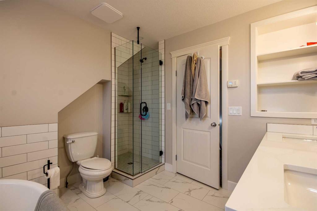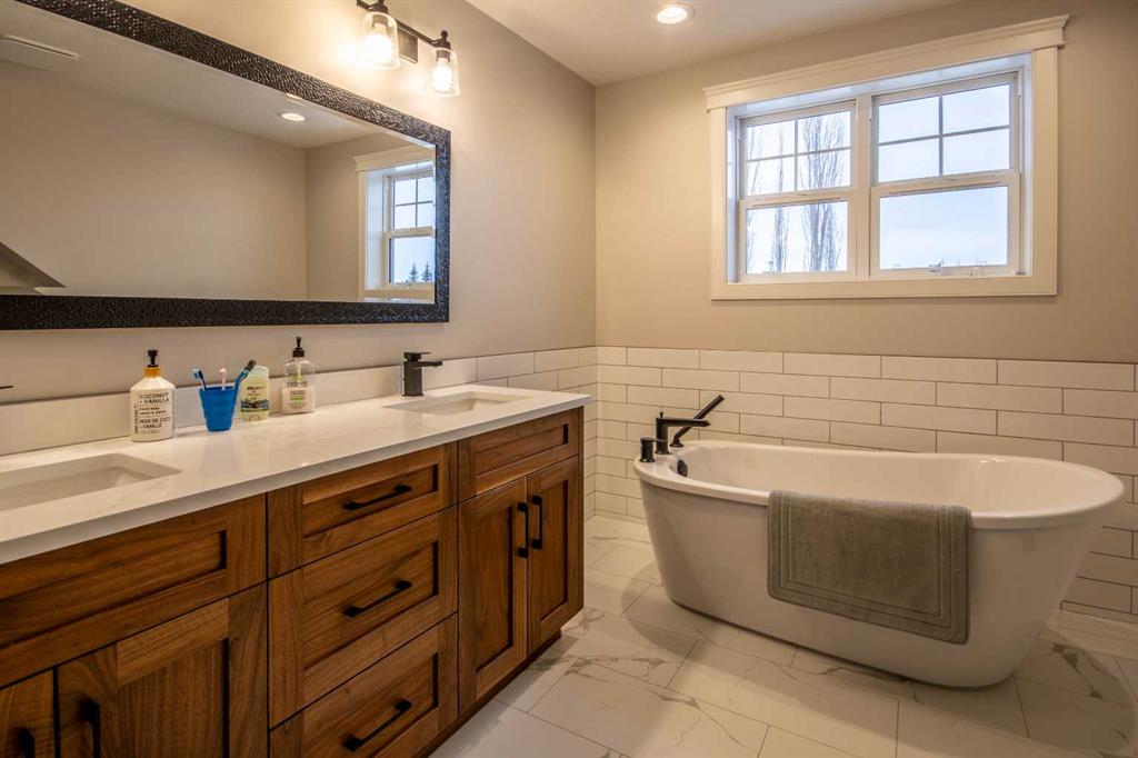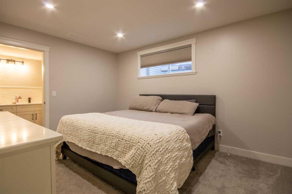 Upstairs offers two generous bedrooms and a five piece bathroom with soaker tub. The lower level provides a cool, quiet retreat with a primary bedroom and ensuite, an additional bedroom, a rec room, and in floor heating.