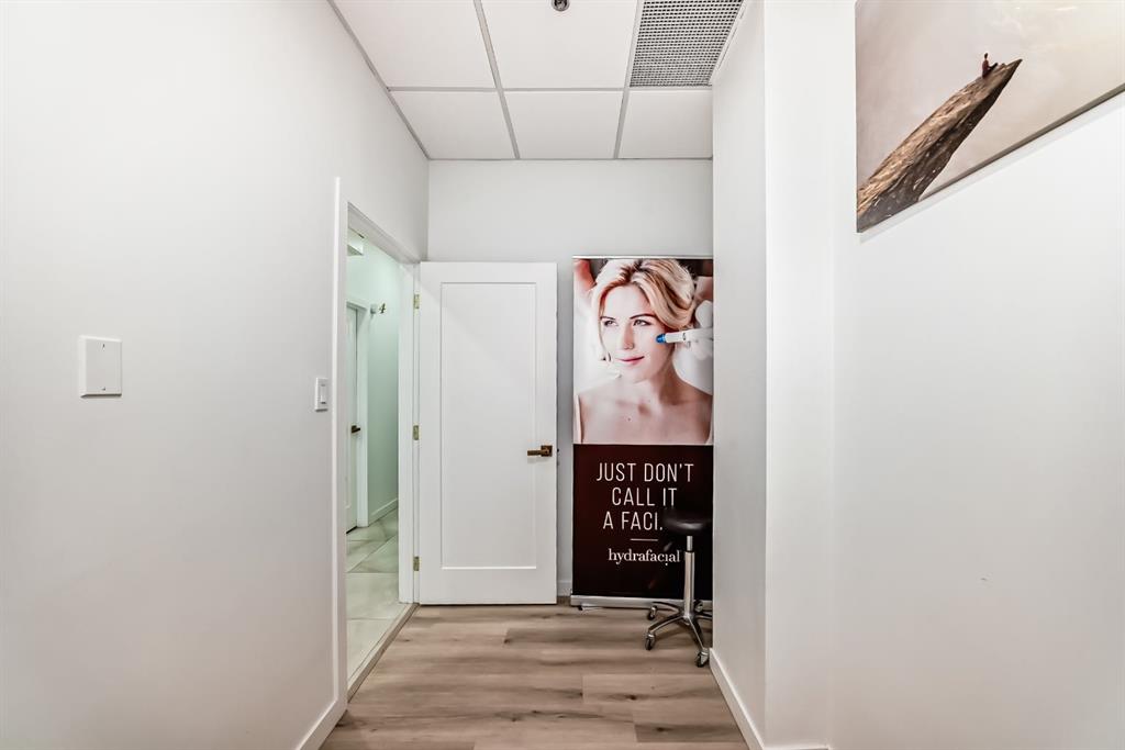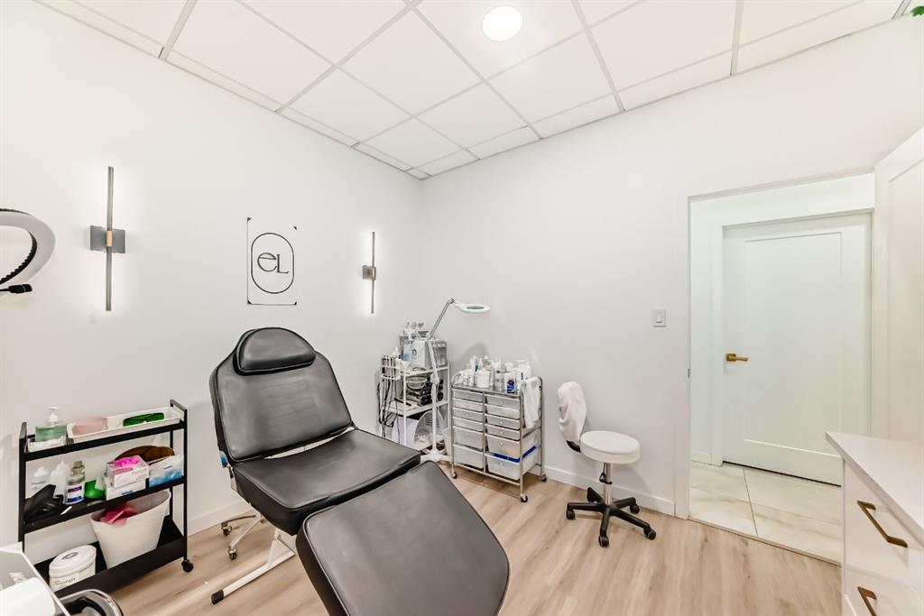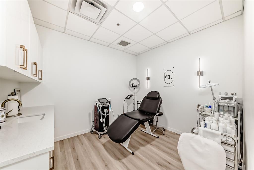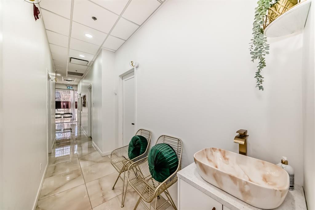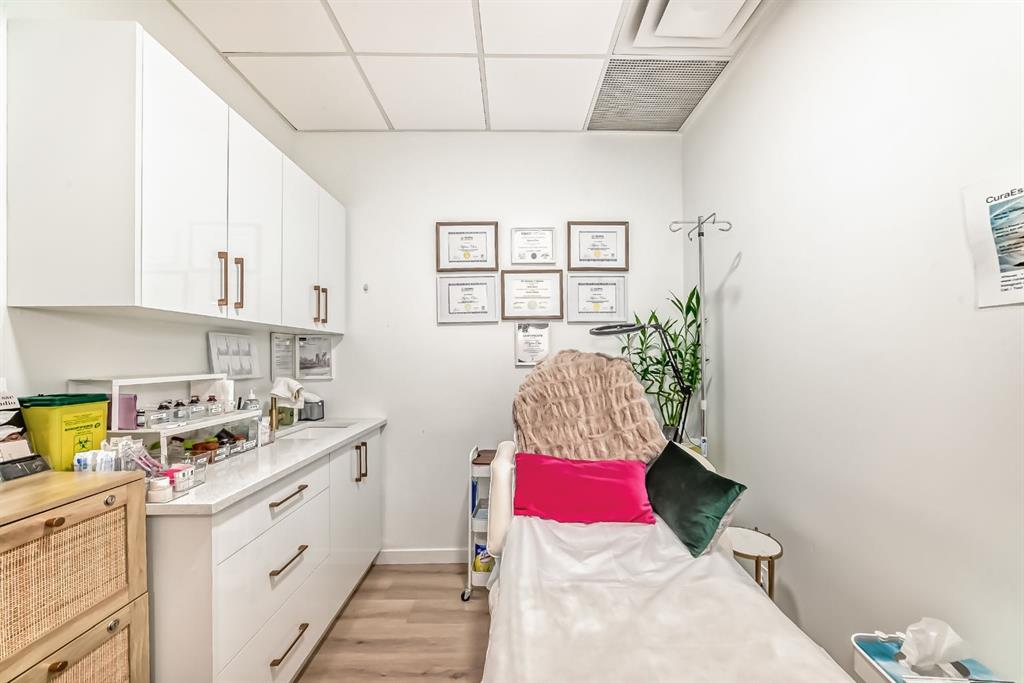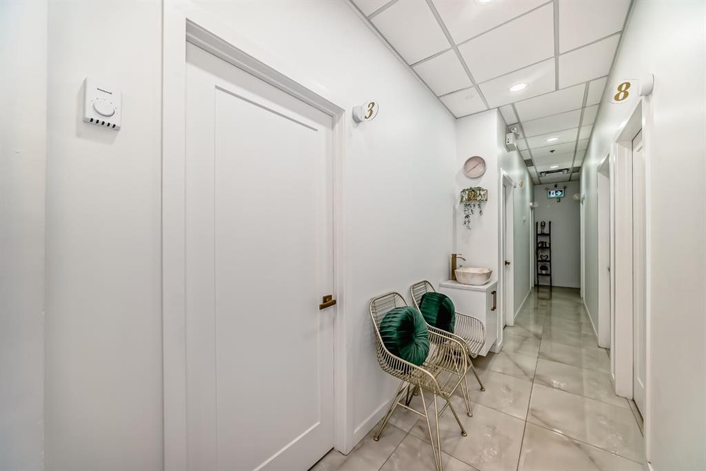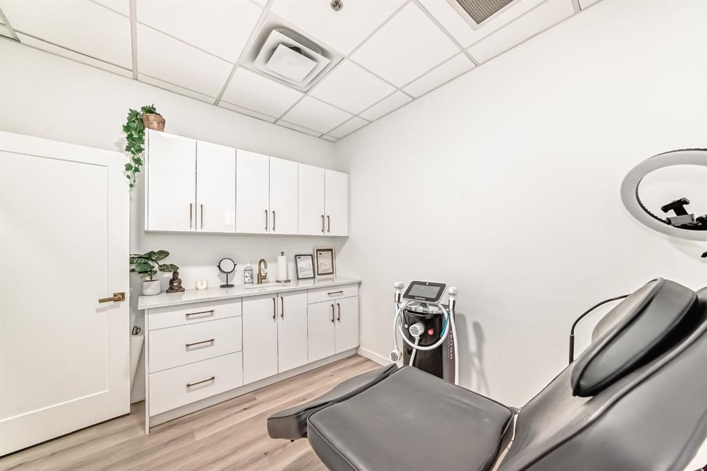 Turn-key professional commercial condominium unit with full clinical infrastructure. Currently operating as an established aesthetics clinic, this impeccably maintained 1,060 square foot suite presents a rare opportunity for medical, wellness, or high-end aesthetics users seeking a fully built-out space. Positioned along the high-exposure Centre Street NW corridor, the unit has been thoughtfully designed to support multiple practitioners while maintaining a refined, boutique atmosphere. The layout features eight private treatment rooms, each equipped with its own sink; an extensive and costly infrastructure upgrade. The space is anchored by a polished front reception and client waiting area that delivers a strong first impression. A central hallway provides efficient circulation, complemented by a private two-piece bathroom and a dedicated laundry and utility room to support daily operations. Dual access points enhance functionality, with a welcoming front entrance for clients and a separate rear exit ideal for staff and deliveries. Two assigned underground parking stalls are included, offering added convenience in this highly accessible inner-city location. This is a rare opportunity to secure a fully plumbed, high-density professional space in a prime Calgary corridor, with immediate usability and long-term flexibility.