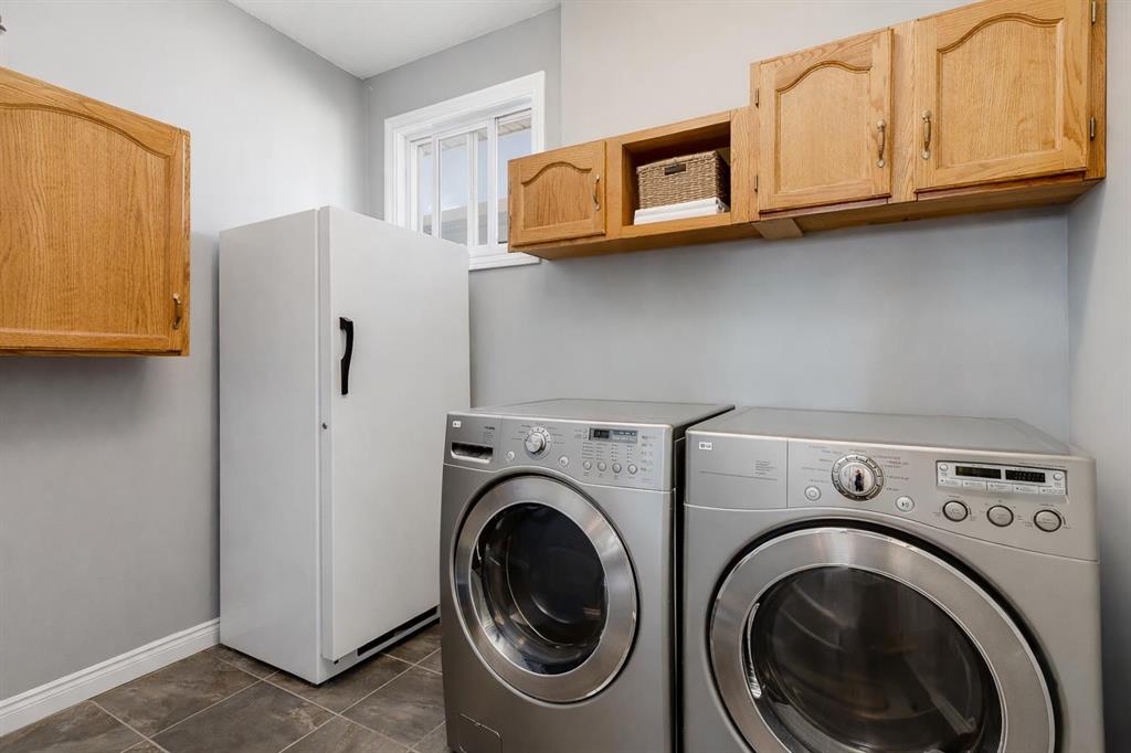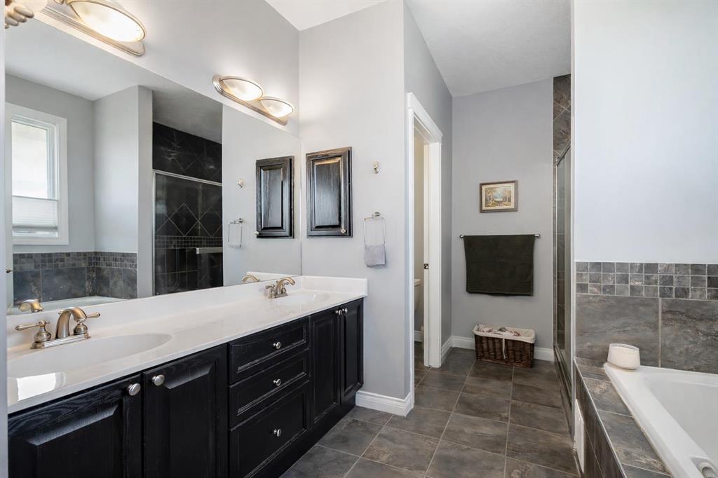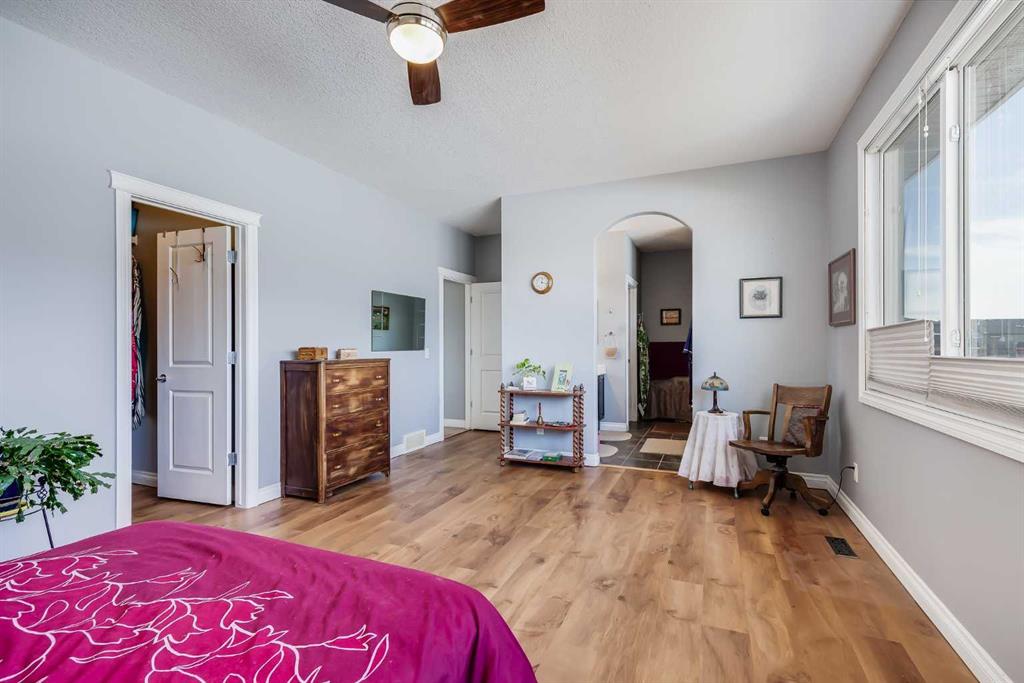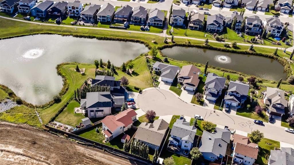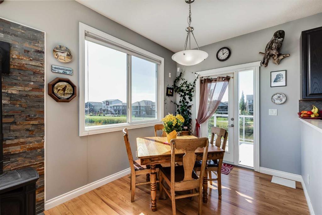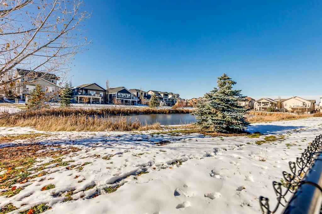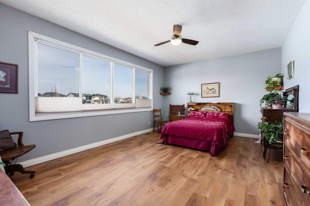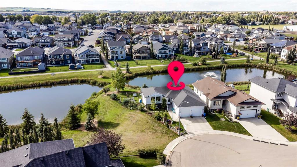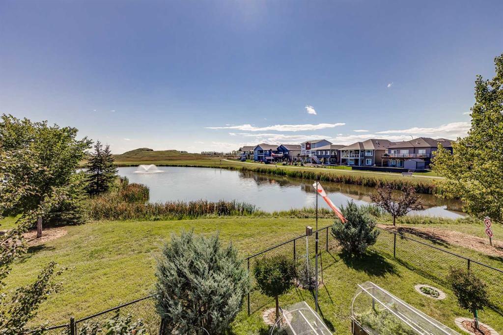Inside, you’re greeted by high ceilings, abundant natural light, and stunning views of two ponds with fountains. The main level features an open-concept layout with a spacious kitchen, a cozy gas fireplace, and an inviting living area designed for both relaxation and entertaining. The generous primary suite includes brand-new vinyl flooring, a large walk-in closet, and a luxurious five-piece ensuite complete with a deep soaker tub, oversized shower, and double sinks. The main-floor laundry room adds convenience and includes a stand-up freezer that stays with the home. The fully finished walkout lower level offers two additional bright and comfortable bedrooms, a full bathroom, and a massive family room perfect for gatherings, hobbies, or movie nights. Step outside to the west-facing backyard, a beautifully landscaped retreat with fruit trees, shrubs, raised garden beds, and plenty of space to relax and enjoy the outdoors. A charming shed provides extra storage, and the seller is leaving all yard tools, including the lawnmower, garden tools, and snow blower, making it easy to maintain the property.
