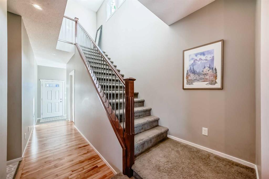 The home features a dramatic staircase enhanced by a tasteful wrought iron upgrade, adding a touch of grandeur to the interior. Main floor potlights illuminate the space, highlighting its architectural beauty, while swing closet doors provide easy access to storage.