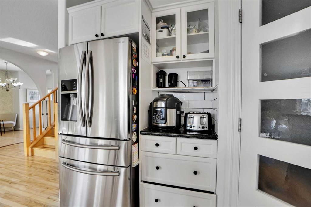 Welcome to this beautifully updated two-storey home with a rare triple attached garage in the sought-after community of Strathcona Park. Recent upgrades include refinished hardwood floors, fresh modern paint, newly painted kitchen cabinetry, central air conditioning, designer wallpaper accents, and a redesigned living room feature wall with custom built-ins and new Fireplace stone work that creates a stylish focal point. The bright open-concept main floor offers an inviting living room with a fireplace, a functional kitchen with large island, ample cabinetry, pantry, and modern appliances, plus a versatile dining area that can also serve as a home office. A laundry room and a 2-piece bathroom complete this level. Upstairs features a spacious bonus room with another fireplace, three bedrooms including a generous primary suite with ensuite, and an additional full bathroom. Hardwood flooring throughout the top two floors adds warmth and elegance. The fully developed basement includes two additional bedrooms connected by an ensuite, a flex space ideal for a gym or office, and plenty of storage. Enjoy the landscaped, fenced backyard with patio, perfect for summer gatherings. The triple car garage with drive-through access to the backyard is a rare and valuable feature. Conveniently located near excellent schools, shopping, parks, and walking paths, this move-in ready home offers space, comfort, and thoughtful updates in a prime locatio