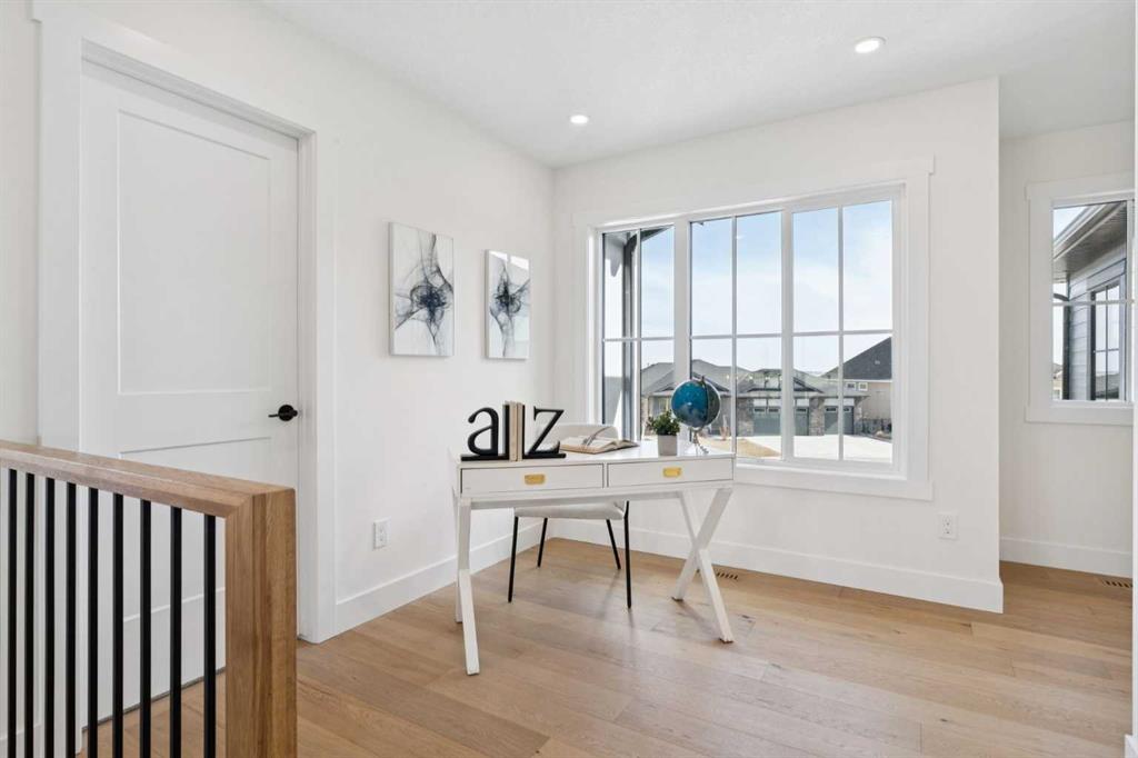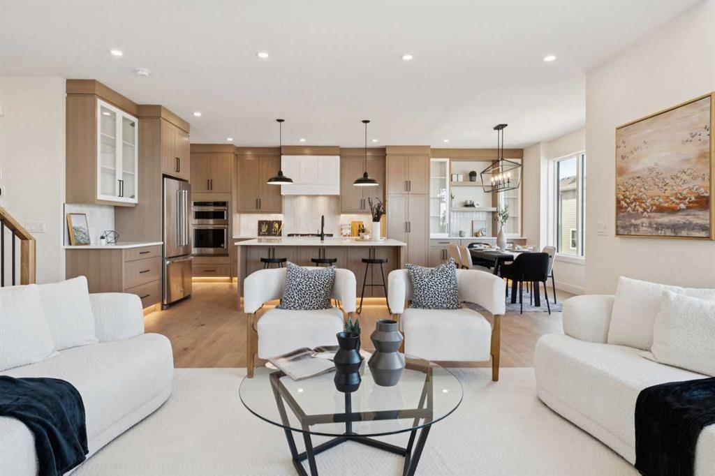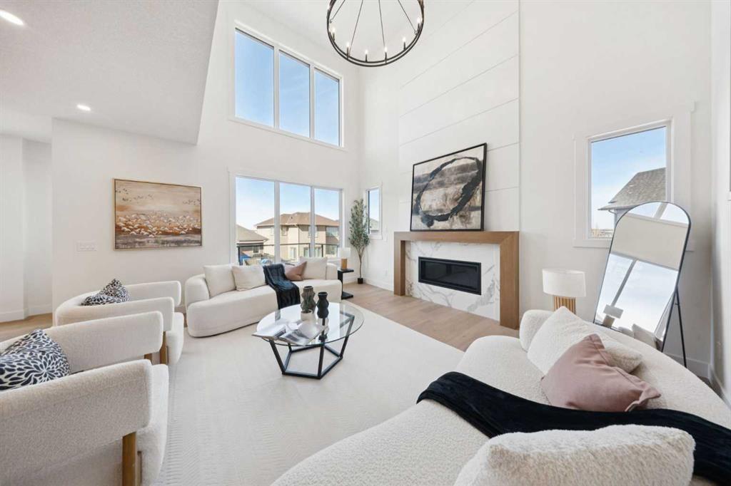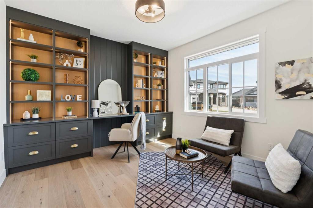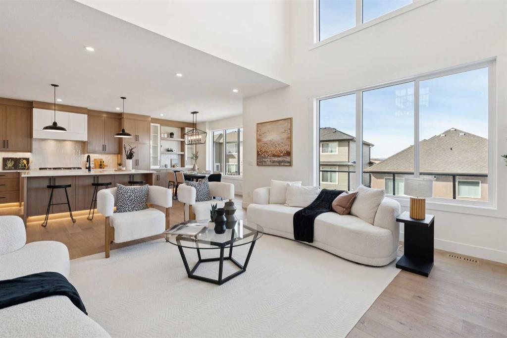 Welcome to an extraordinary walkout estate set on a premium 0.24-acre walkout lot in one of Okotoks’ most exclusive cul-de-sacs. Thoughtfully crafted, this home blends striking architectural presence with an elevated, design-driven interior—offering a truly refined luxury living experience. From the moment you enter, the home makes a lasting impression. A dramatic 17’ open-to-above great room is framed by oversized windows, flooding the space with natural light while showcasing a stunning fireplace with custom full-height millwork. The scale, light, and craftsmanship create a sense of both grandeur and warmth rarely found. The kitchen is a true showpiece—designed to impress and built to perform. Featuring custom white oak cabinetry, quartz countertops, and a premium KitchenAid appliance package, the space is anchored by a sculptural hood fan and elevated by thoughtful details throughout. Subtle under-cabinet and toe-kick lighting enhance the ambiance, while the oversized island and adjacent dining area complete with a coffee bar create the perfect setting for both intimate dinners and large-scale entertaining. A fully built-out main floor office offers a boutique workspace with custom millwork, integrated lighting, and designer finishes—ideal for professionals working from home. The mudroom continues the elevated aesthetic with shiplap detailing, checkerboard tile flooring, champagne brass hardware, and built-in storage that blends function with style. Upstairs, the oversized primary retreat is a private sanctuary, complete with tray ceilings, designer feature wall, ambient LED lighting, and peaceful mountain views. The spa-inspired ensuite is equally refined, featuring a freestanding soaker tub, glass-encased shower, dual vanities, and warm, modern finishes that create a calming, hotel-like experience. Additional bedrooms, a bonus/media room, and a designer laundry space complete the upper level. The walkout basement remains unfinished, offering the opportunity to work directly with the builder to create a fully customized lower level tailored to your lifestyle—whether that be a home theatre, wellness space, or extended living area. Outdoor living is equally well considered, with a rear deck complete with a gas line for BBQ—perfect for entertaining while taking in the surrounding views. Positioned at one of the highest elevations in Okotoks, this home captures sweeping views of the Sheep River Valley and Rocky Mountains. The oversized, pie-shaped lot offers exceptional privacy and flexibility for future outdoor living at scale. Completed with a triple attached garage and timeless exterior finishes, this home is covered by Alberta New Home Warranty. Price includes GST. A rare opportunity to own a move-in ready estate home where design, craftsmanship, and setting come together in perfect balance.