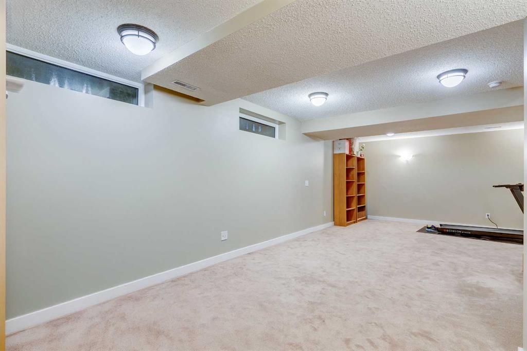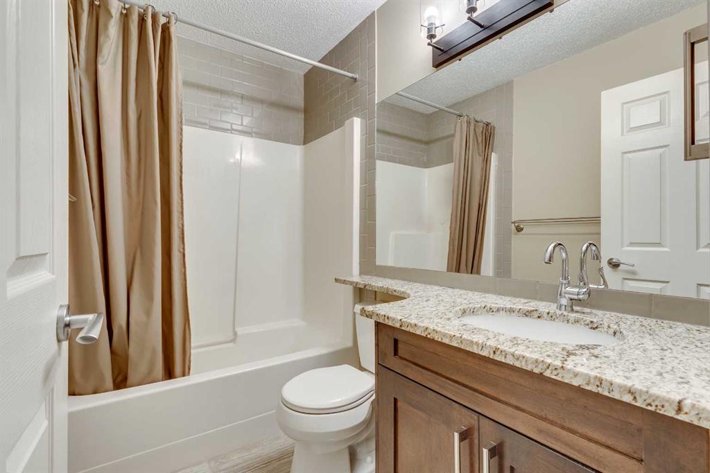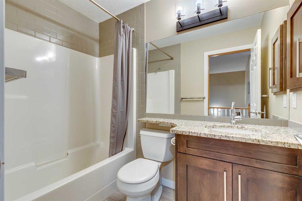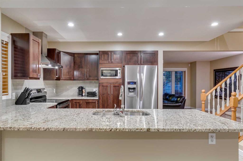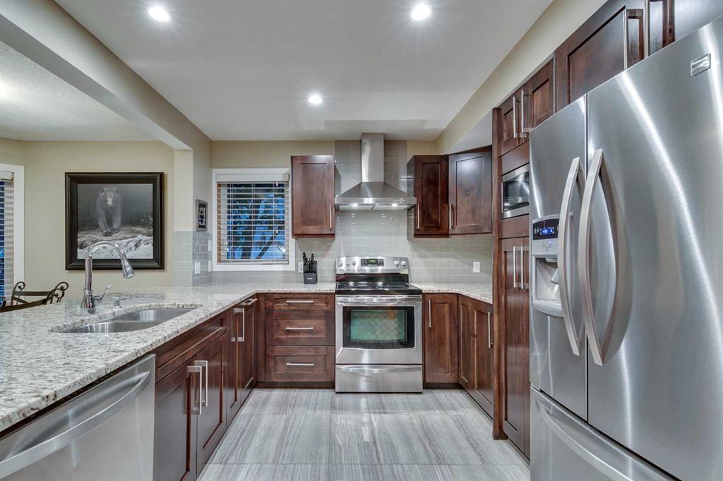 Absolutely spectacular! One of the best locations in Inglewood adjacent to the bike path and Bow River. Massive, custom renovation top to bottom! Corner end unit with a double attached garage will fit a full sized vehicle plus a shorter vehicle. South and west facing means tons of sunlight! 3 bedroom, 2.5 baths, over 2000 square feet of total developed living space. High end TRIPLE pane windows that fully open at a 90 degree angle from Centra (Supreme Windows). The patio door and basement windows are also triple pane. High gloss 12″x24″ tile flooring in the entrance, main bath, kitchen, dining room, and upstairs bathrooms. Gorgeous kitchen with thick granite countertops with rounded corners, large eating ledge, undermount sink with soap dispenser, custom pull out drawer system, stainless steel dropped hoodfan with tile backsplash to the ceiling, built in wall microwave, stainless steel appliances including an ultra quiet dishwasher, flat top stove, french door fridge with pull out bottom freezer with ice/water dispenser, stained maple cabinets with soft close doors and 9″ chrome handles. Pot lights in kitchen, entrance and upstairs hallway. Knockdown ceilings on entire main floor except the half bath which is a flat drywall ceiling. Massive sized living room has hardwood inspired tile flooring, ceiling fan with remote, and custom floor to ceiling stonework around the gas fireplace with internal blower fan. Feature accent lighting installed on the stonework. Large windows in the living room with a sliding door, leading to a large 8’x16’2″ west facing deck with a natural gas line. Upstairs has 3 bedrooms including a large master, ceiling fan with remote, and a huge walk in closet measuring 8’x6’6″. Both the ensuite and the second bathroom have the same granite, cabinets, undermount sinks, and tile flooring as found in the kitchen. All bathrooms have high quality Kohler toilets with soft close lids. Bedrooms 2 and 3 have a custom double door closet. Bedroom 2 has ceiling fan with remote. Fully finished basement with huge rec room and family room has plush carpet with thick underlay. Large storage room with front loading red LG washer and dryer with pedestals. 3.5″ tall baseboard casings throughout the house. Custom “Bungalow Beige” paint color throughout the house. 60 gallon hot water tank installed in 2022. 2.5″ white faux wood blinds throughout the house. Driveway will hold a vehicle angle parked. Amazing views to the west of the massive trees. Outside stucco painted / refreshed in 2023. Front porch and rear deck is composite board material with white metal railings. The Inglewood Village On The Bow complex is very well run with a $3.1 million dollar reserve fund and wasn’t affected by the 2013 flood.