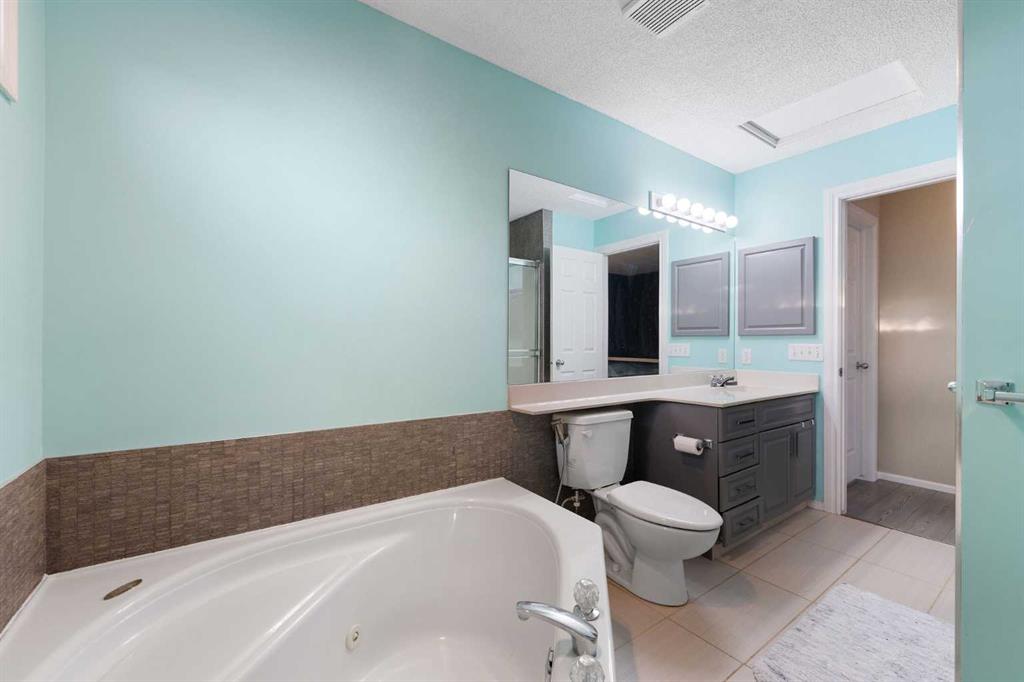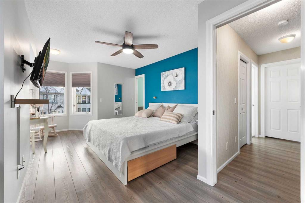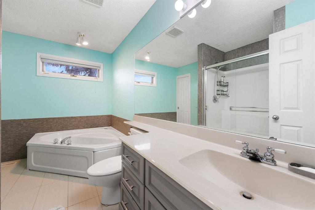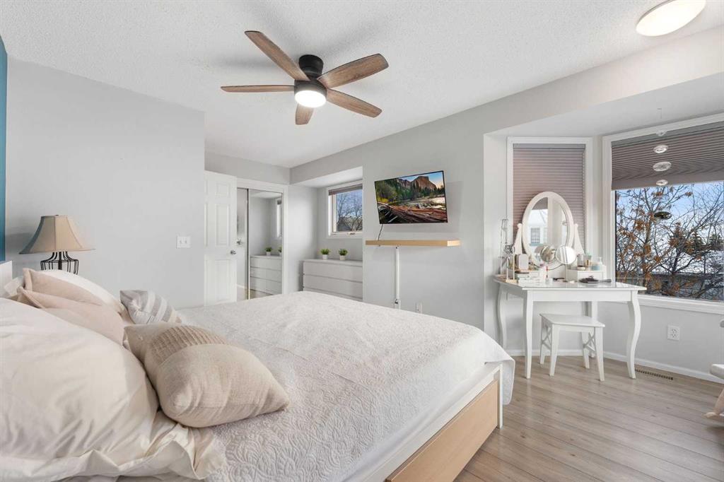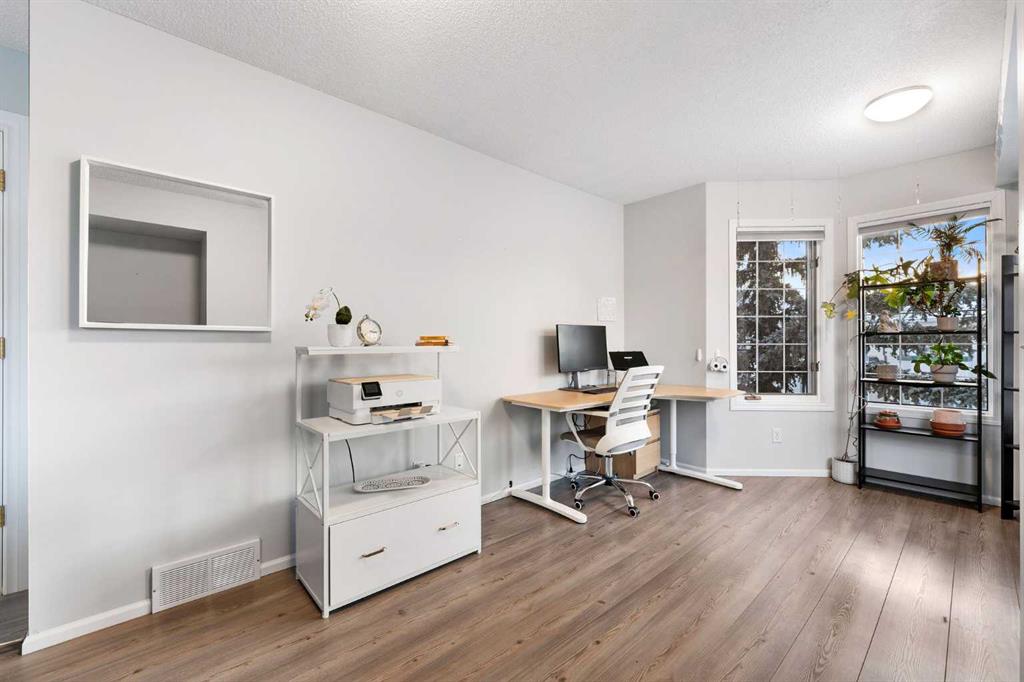Upstairs offers two spacious bedrooms. The primary bedroom includes a walk in closet and direct access to the 4 piece bathroom with soaker tub and separate shower. The second bedroom comfortably fits a bedroom setup with additional space for an office.