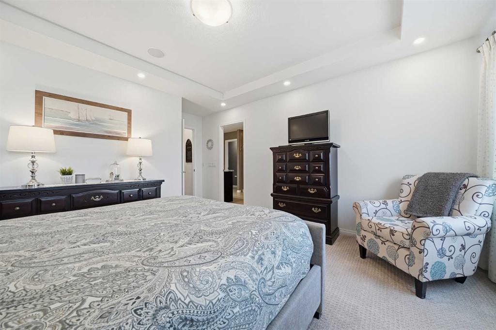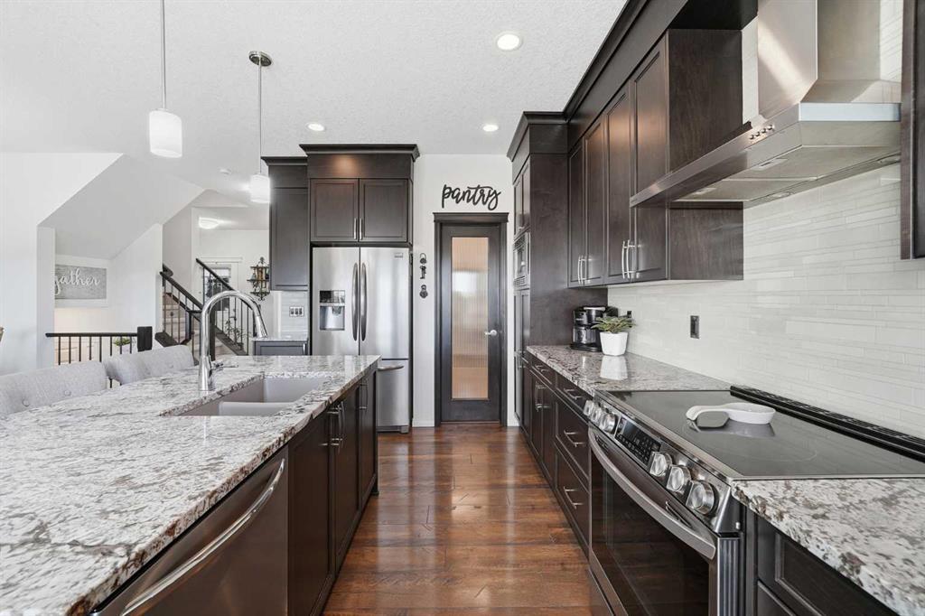 This former Excel showhome has been impeccably maintained, offering a rare blend of elevated design, thoughtful functionality, and family-friendly living. With classic curb appeal, mature trees, irrigation, an extended composite deck, and higher fencing, the exterior is both polished and private. Inside, the home showcases 9’ main-floor ceilings, wide-plank engineered hardwood, ceramic tile, upgraded shutter blinds throughout, and striking wrought-iron railings – details that reflect true quality. The gourmet kitchen anchors the main floor, featuring upgraded cabinetry & mouldings, gorgeous stone countertops, large island w/ undermount sink, stainless steel appliances (newer stove & fridge w/ water/ice), and a walk-through pantry with custom built-ins – perfect for both entertaining and busy family life. The living room is warm and inviting with large windows, and features a stunning fireplace. The main floor is finished with a mudroom (with custom built in), 2pc bath removed from all living spaces, handy closets & a generously sized dining area. Heading upstairs you’ll notice a stunning skylight, and how the floorplan is thoughtfully designed with families in mind. A bright bonus room with vaulted ceilings, 2 generously sized bedrooms each with walk-in closets, a full 4-piece bath, and a built-in workspace ideal for homework or working from home. The primary retreat feels like a private escape, with an upgraded tray ceiling, walk-in closet, and a spa-inspired 5-piece ensuite with a separate water closet. Upstairs is complete with a laundry room w/ additional storage. Downstairs, the fully finished basement adds exceptional versatility with a spacious rec room featuring additional baseboard heat, a 4th bedroom, a 3-piece bath, and ample storage. Additional upgrades include air conditioning, heated garage, Vacu-Flo system, recessed lighting, added trees in the backyard, and surround-sound wiring throughout the main and upper floors. Ideally located steps from a large park and green space, and offering quick access to Mcleod Trail and Stoney Trail, this home delivers showhome-quality finishes, everyday comfort, and an exceptional setting for growing families who appreciate refined living.