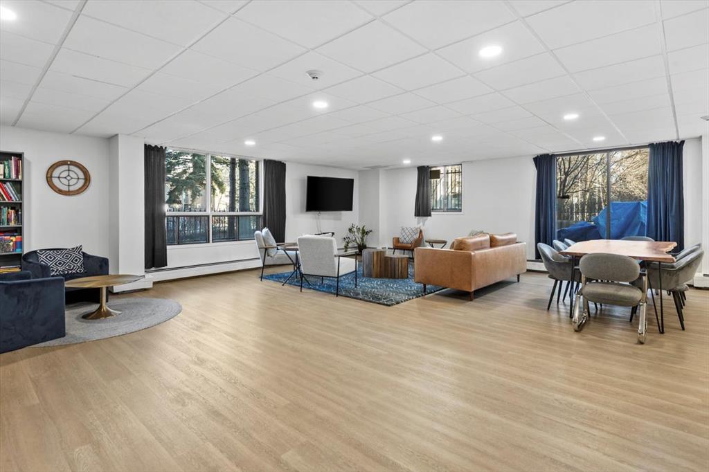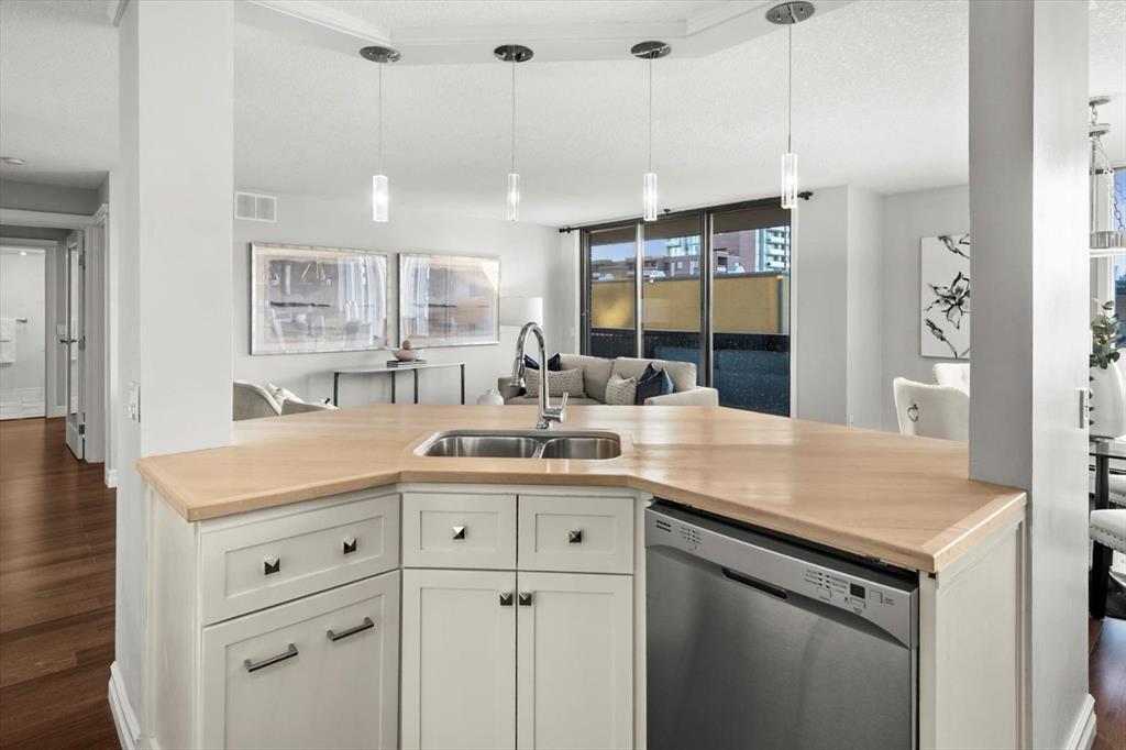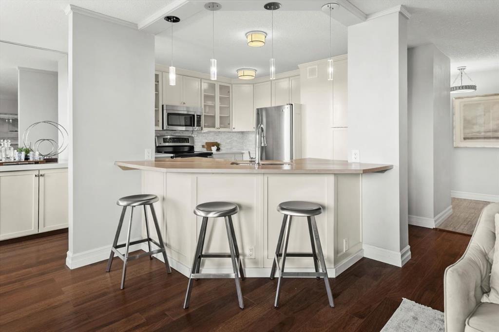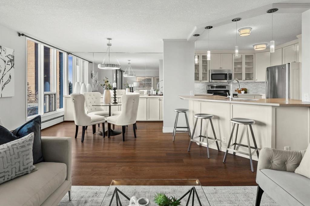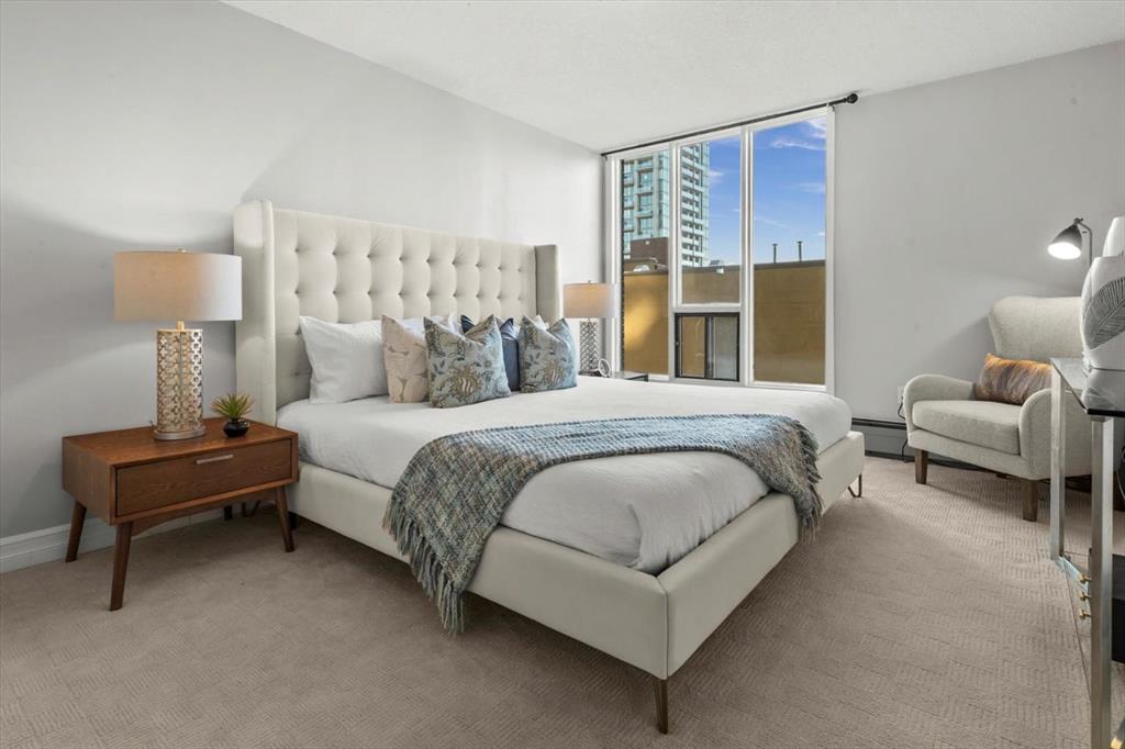 Are you looking for an airy condo in a premium location with a sunny south exposure, and a shared rooftop terrace? What about over 1150sqf with numerous renovations, a large balcony and steps from the restaurants and shoppes of 17th Avenue? This open concept home features A/C, in home storage, an updated kitchen and bathrooms set behind a spacious foyer. A well-managed complex right in the heart of the Beltline, Cozart is amenity rich with onsite management, a party room, Sky Lounge, gym and car wash. In addition to being super transit accessible – walk to work, or out to meet friends at local treasures like Betty Lou’s Library, Alumni or The Sweatered Hen. Many condos in the DT have you walk right into the living area, but this home has a grand tiled entrance foyer, and as you walk into the space – take note the natural light cascading through bright windows. The oversized kitchen with eat up island provides plentiful storage and counter space, plus a custom built in dry bar/buffet. The dining area sets the scene for many a dinner party, and the living room allows you to host numerous friends for games night, or to watch your favourite shows. The primary suite is set back from the living area and easily fits a king size bed plus has room for a reading nook, with closet storage, built in library shelving and an ensuite bathroom complete with soaker tub and stand-up shower. Also find a second bedroom that is great for a guest room, home office or den, a 3-piece bathroom and in suite storage/laundry room. An assigned underground parking stall and storage locker complete this offering. Whether you are downsizing or moving up to a bit more space, this home is ready for a new owner. Enjoy year-round views from the rooftop patio that also has a cherished solarium lounge. This building is well managed, well maintained and celebrates community. Come and have a look before She Gon’!