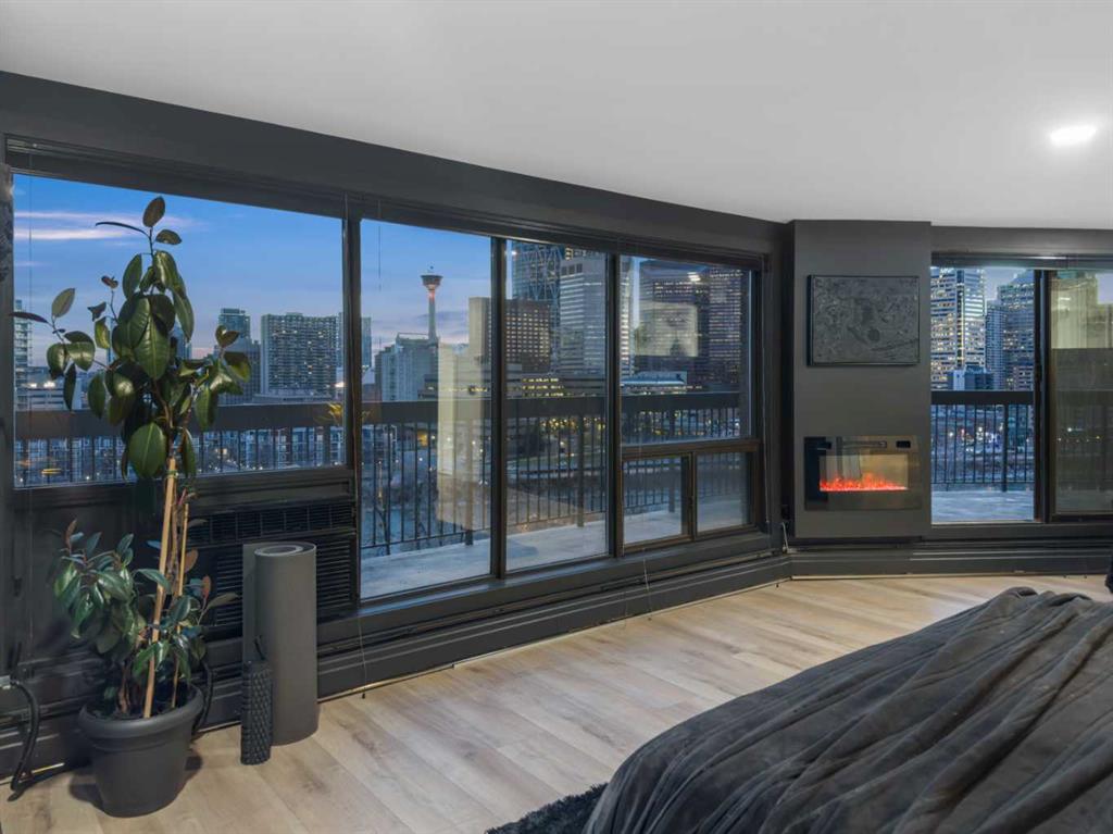As day turns to night, the city transforms into a sparkling backdrop that creates a truly magical ambiance. A sleek linear gas fireplace warms the main living area, while the primary bedroom retreat features its own electric fireplace—perfect for cozy evenings with the unreal skyline as your companion.