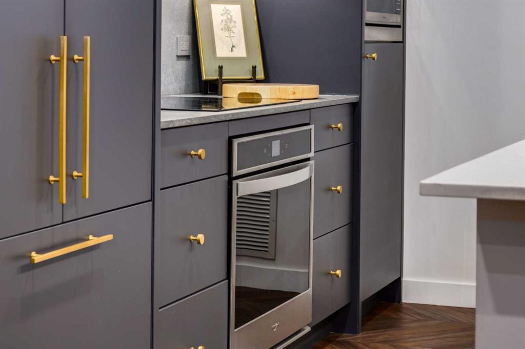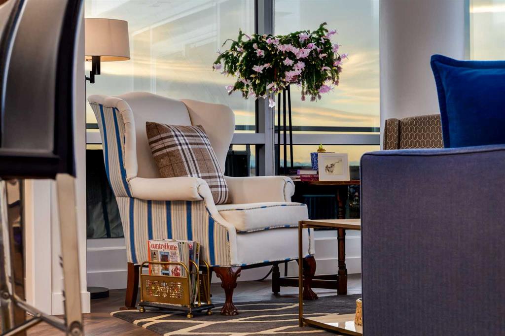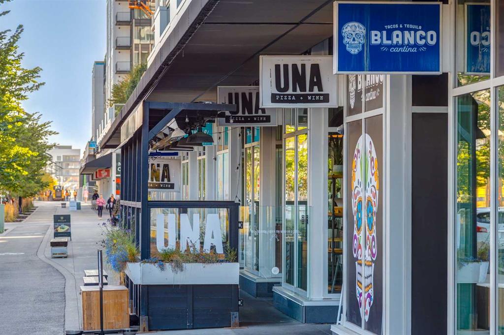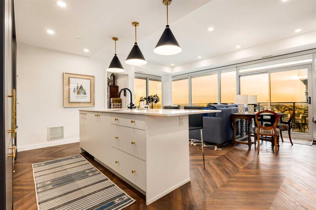 Experience elevated urban living in this warm and inviting two-bedroom residence offering over 1,100 square feet of thoughtfully designed interior space and a wraparound terrace perfect for everyday outdoor living and relaxed entertaining. Blending a cozy Ralph Lauren–inspired aesthetic with modern finishes, this home features chevron-patterned flooring, designer lighting, and flat-painted ceilings that create a timeless atmosphere throughout. The chef-inspired kitchen is the heart of the home, showcasing matte grey slate cabinetry with soft-close hardware, brushed-gold accents, quartz countertops, and a matching backsplash. Premium appliances include a Frigidaire induction cooktop, Elica hood fan, Fisher & Paykel integrated fridge and freezer, and Whirlpool oven, complemented by a deep grey Blanco sink, elegant black pendant lighting, and a spacious walk-in pantry. The open living room and dining areas are bathed in natural light from expansive windows that frame stunning mountain views, while a charming reading/coffee nook offers the perfect spot to unwind or start your day. The versatile second bedroom can easily serve as a guest room, home office, or creative space, complete with a walk-in closet and a stylish four-piece bathroom. The primary suite feels calm and comforting, with warm neutral tones, a walk-in closet, and a spa-like ensuite featuring dual vanities, quartz countertops, and a glass-enclosed shower. Additional features include a new Electrolux washer and dryer, generous linen storage, one titled underground parking stall, and two large storage units. The wraparound terrace enhances daily living with ample space for outdoor lounging and garden greenery, creating a private retreat in the heart of the city. Residents enjoy access to premium amenities including a rooftop patio, private owner’s lounge, secure underground visitor parking, bike storage, EV charging stations, and concierge services. Ideally located in Calgary’s West District, you are surrounded by parks, walking paths, boutique shops, cafés, and dining options. Book your private viewing today!
