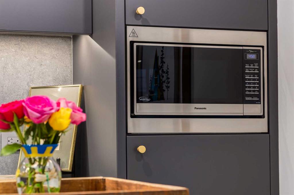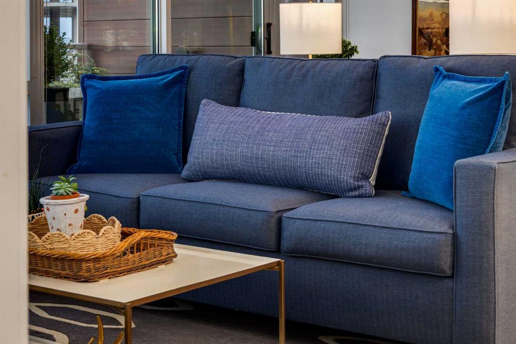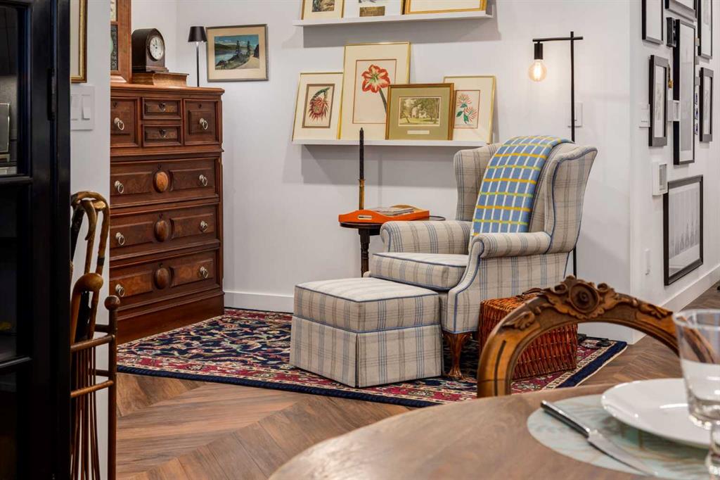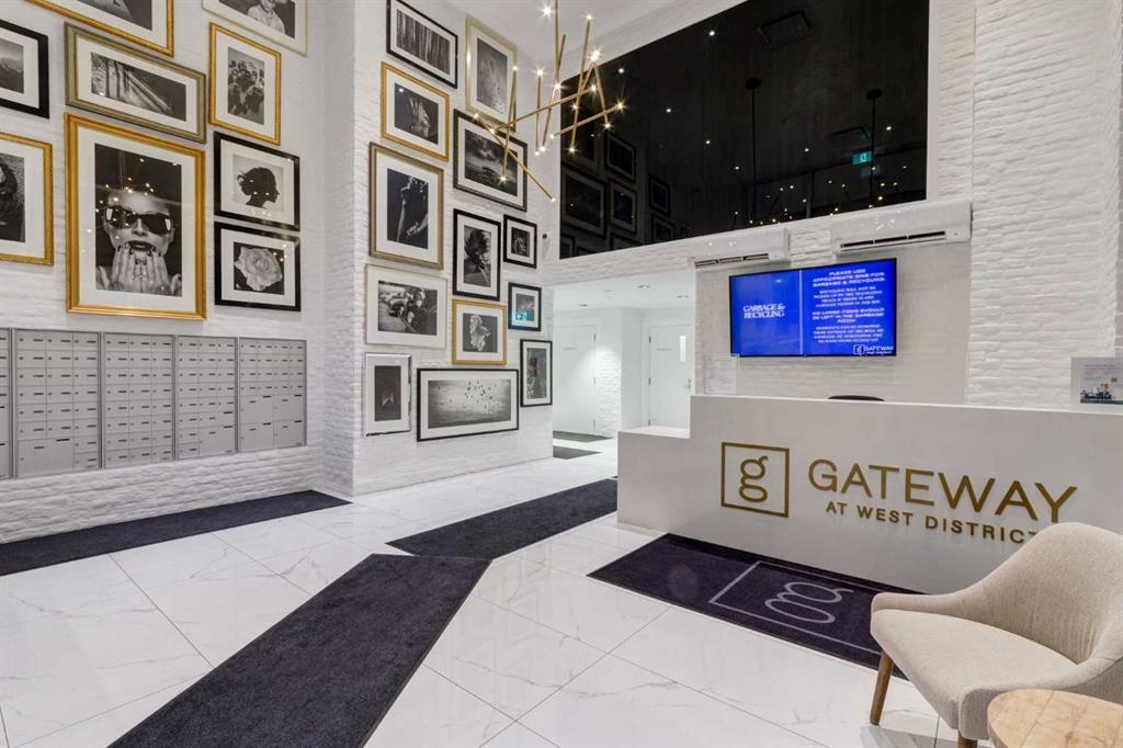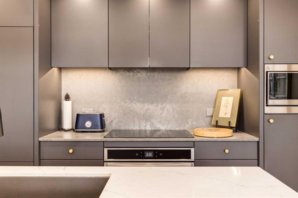 Experience elevated urban living in this warm and inviting two-bedroom residence offering over 1,100 square feet of thoughtfully designed interior space and a wraparound terrace perfect for everyday outdoor living and relaxed entertaining. Blending a cozy Ralph Lauren–inspired aesthetic with modern finishes, this home features chevron-patterned flooring, designer lighting, and flat-painted ceilings that create a timeless atmosphere throughout. The chef-inspired kitchen is the heart of the home, showcasing matte grey slate cabinetry with soft-close hardware, brushed-gold accents, quartz countertops, and a matching backsplash. Premium appliances include a Frigidaire induction cooktop, Elica hood fan, Fisher & Paykel integrated fridge and freezer, and Whirlpool oven, complemented by a deep grey Blanco sink, elegant black pendant lighting, and a spacious walk-in pantry. The open living room and dining areas are bathed in natural light from expansive windows that frame stunning mountain views, while a charming reading/coffee nook offers the perfect spot to unwind or start your day. The versatile second bedroom can easily serve as a guest room, home office, or creative space, complete with a walk-in closet and a stylish four-piece bathroom. The primary suite feels calm and comforting, with warm neutral tones, a walk-in closet, and a spa-like ensuite featuring dual vanities, quartz countertops, and a glass-enclosed shower. Additional features include a new Electrolux washer and dryer, generous linen storage, one titled underground parking stall, and two large storage units. The wraparound terrace enhances daily living with ample space for outdoor lounging and garden greenery, creating a private retreat in the heart of the city. Residents enjoy access to premium amenities including a rooftop patio, private owner’s lounge, secure underground visitor parking, bike storage, EV charging stations, and concierge services. Ideally located in Calgary’s West District, you are surrounded by parks, walking paths, boutique shops, cafés, and dining options. Book your private viewing today!