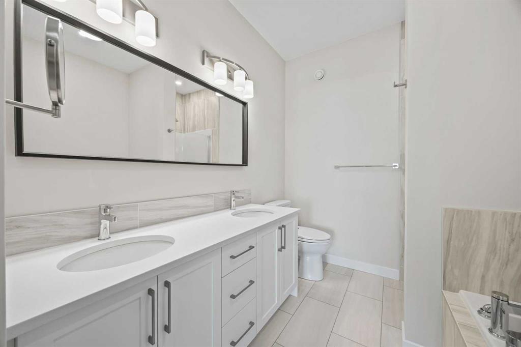 Upstairs, you’ll find two spacious double primary suites, each with its own private ensuite—one showcasing a double vanity, soaker tub, and walk-in shower. Built-in closet shelving adds a custom touch, and upper-level laundry brings everyday convenience.
