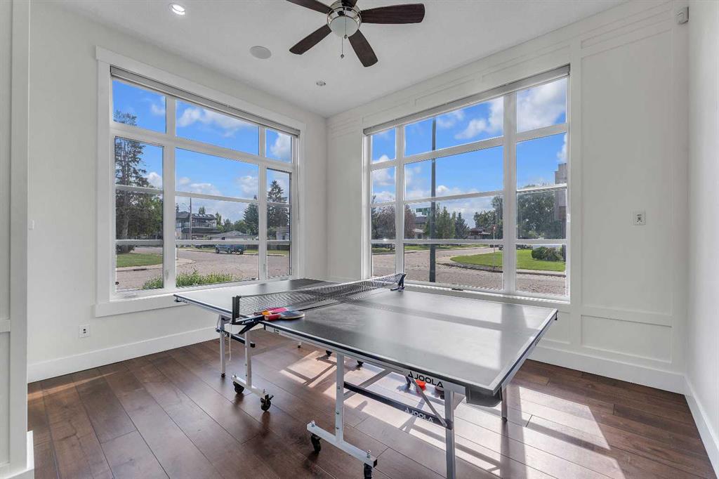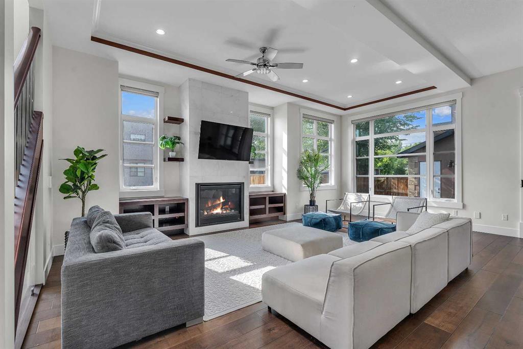 As you approach the home, the curb appeal is immediately striking—classic architecture framed by mature trees and a stately corner presence. Step through the elegant double French doors, and you’re instantly captivated by the sense of grandeur: dark hardwood floors, crown molding, and soaring 11-foot tray ceilings welcome you in, while natural sunlight floods through oversized windows, creating a warm, inviting ambiance throughout. The main floor is thoughtfully designed for both entertaining and everyday living. A spacious office provides the perfect space to work from home, while a separate main floor bedroom with a private 3-piece ensuite offers comfort and accessibility for guests or family members.