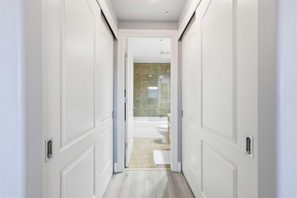 Welcome this bright and spacious 2-bedroom, 2-bathroom condo on the sixth floor of Emerald Stone, offering comfort, convenience, and a prime location. The open-concept layout features 9 ft ceilings, beautiful hardwood flooring, and expansive south-facing windows that flood the space with natural light. The kitchen is both stylish and functional, complete with granite countertops, full-height cabinetry, and a convenient breakfast bar, perfect for casual dining or entertaining. The primary bedroom includes a double walk-through closet and a 4-piece ensuite, while the second bedroom sits adjacent to a 3-piece bath, making it ideal for guests or a home office. Enjoy year-round comfort with central air conditioning and the convenience of in-suite laundry. Step outside onto the sunny balcony, the perfect spot for afternoon drinks or evening BBQs. This unit also includes a titled underground parking stall with an assigned storage locker located directly in front of it. Residents of Emerald Stone enjoy access to additional amenities, including a fully equipped fitness center, recreation and party rooms, visitor parking, indoor bicycle storage, and a weekday concierge service. Located just steps from vibrant 17th Avenue, you’ll be surrounded by trendy shops, restaurants, and nightlife, with the downtown core and several inner-city parks only a short walk away. If you’re looking for modern city living in a fantastic location, this condo is the perfect fit. Don’t miss your chance to make Emerald Stone your home! Book your showing today!